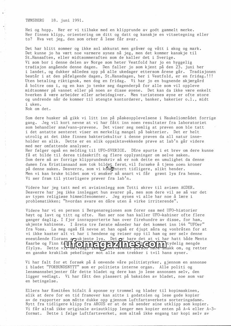 This issue of UFO-BLØFF! from August 1991 covers a UFO sighting in Nord-Østerdalen, Norway, by Bodil Gerzhaliu and Elisabeth Herrebrøden, who filmed and photographed an unusual lig