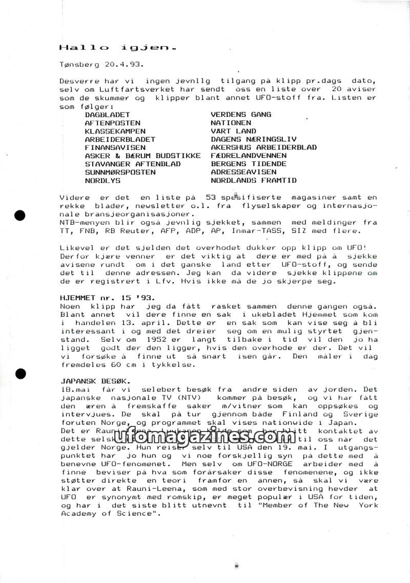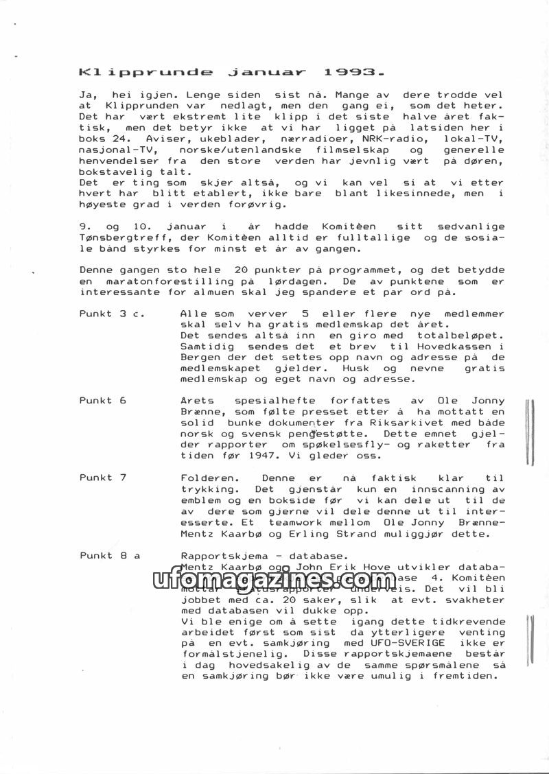 This issue of Klipprunde from January 1993 details UFO-NORGE's activities, including a Tønsberg meeting with 20 agenda points, membership drives, and the development of a report da