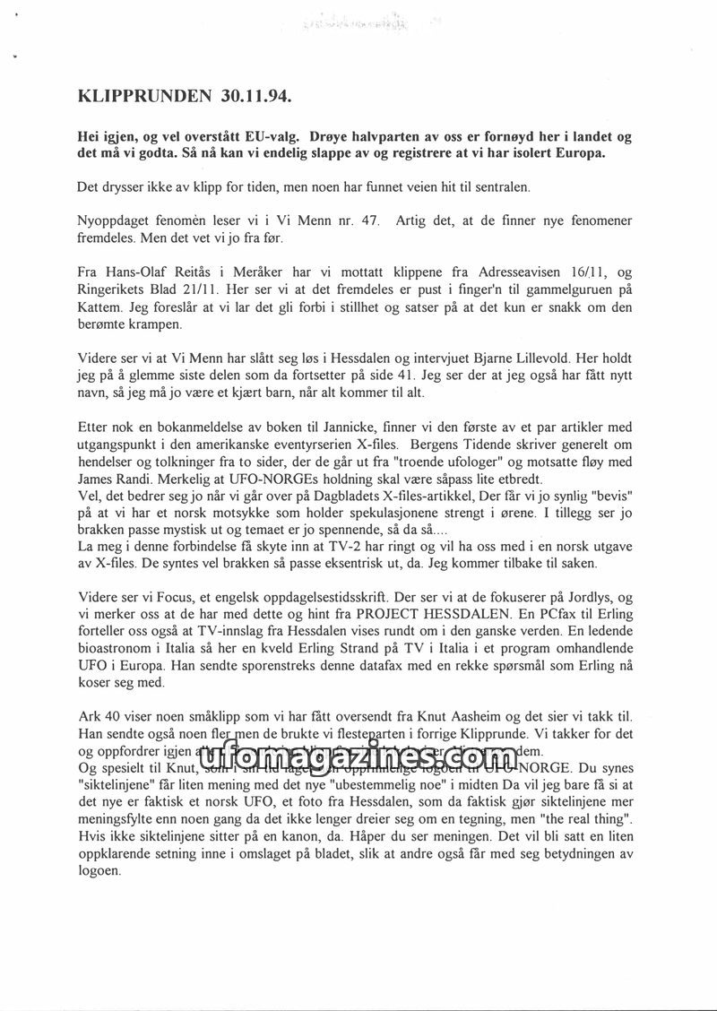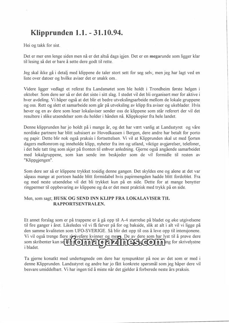 This issue of Klipprunden covers the period from January 1 to October 31, 1994, and includes a compilation of newspaper clippings related to UFO sightings across Norway. It also de
