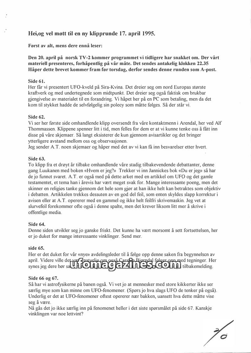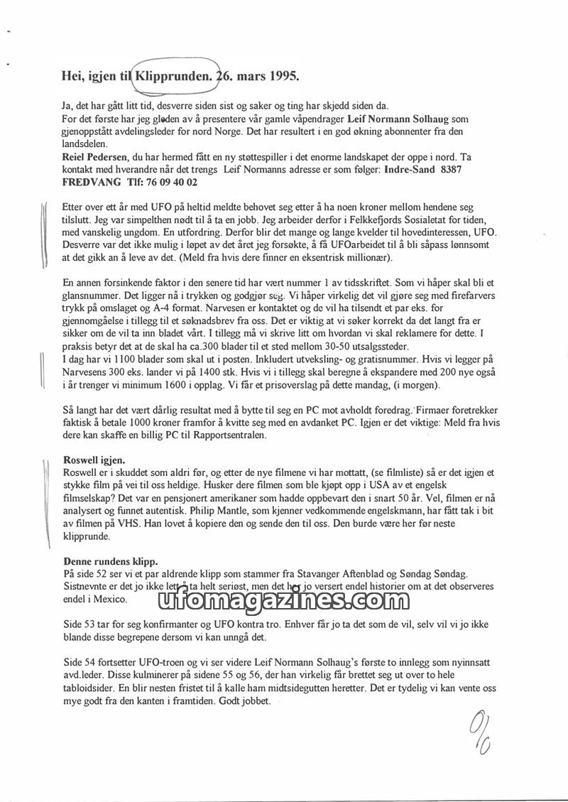 This issue of Klipprunden from January 1995 covers recent UFO sightings and ongoing investigations by UFO-NORGE. It includes reports from various locations in Norway, such as Voss,