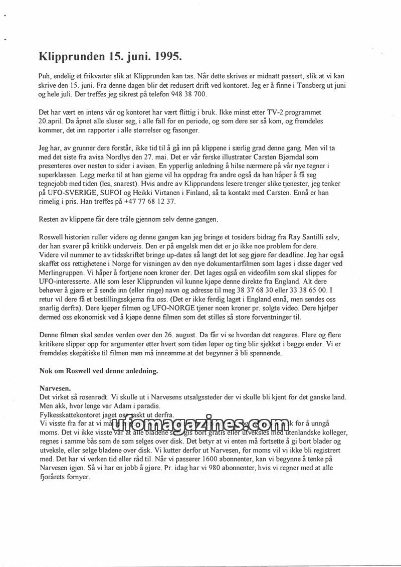 This issue of Klipprunden from June 15, 1995, covers a range of UFO-related topics. It includes witness accounts of a possible meteorite or UFO sighting over Beiarn, Norway, and a