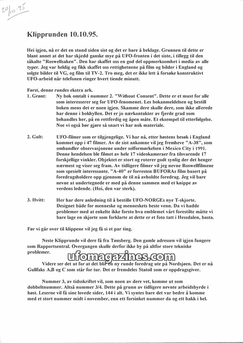 This issue of Klipprunden, dated 10.10.95, provides an update on UFO-related news, including the 'Roswell Incident' and its media attention. It reviews new books like 'Without Cons
