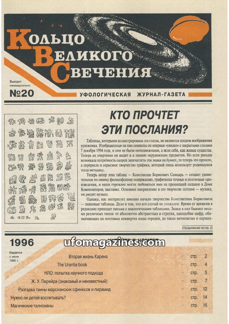 This issue of 'Koltso Velikogo Svecheniya' magazine delves into various paranormal and esoteric topics. It features an article on symbolic messages received by artist Konstantin Bo