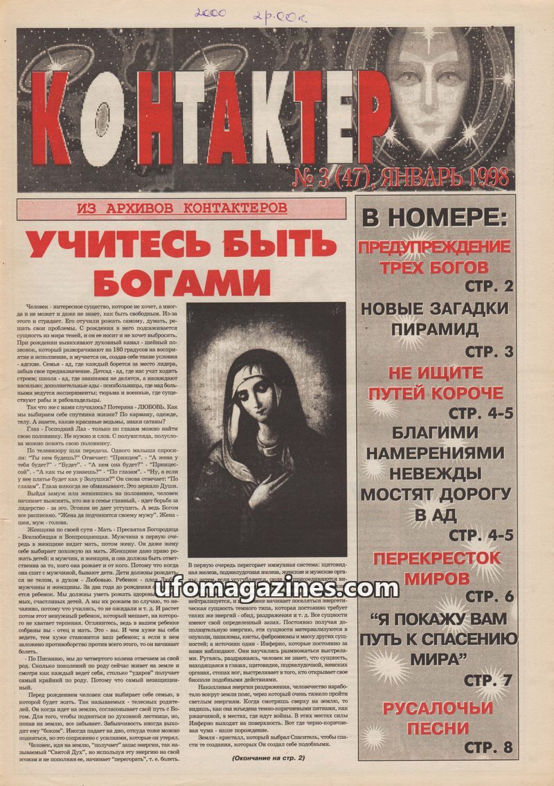 This issue of KONTAKTOR delves into spiritual and paranormal topics. The lead article, 'Learn to Be Gods,' discusses human suffering, the loss of love, and the importance of spirit