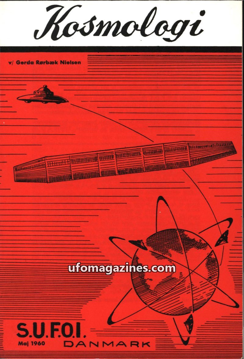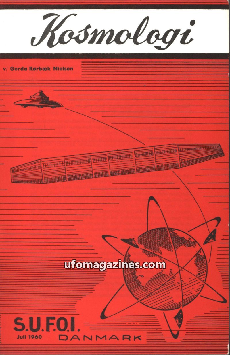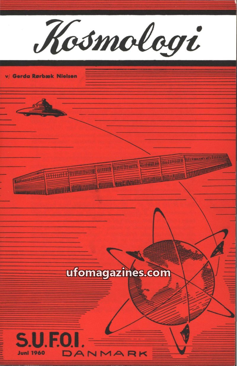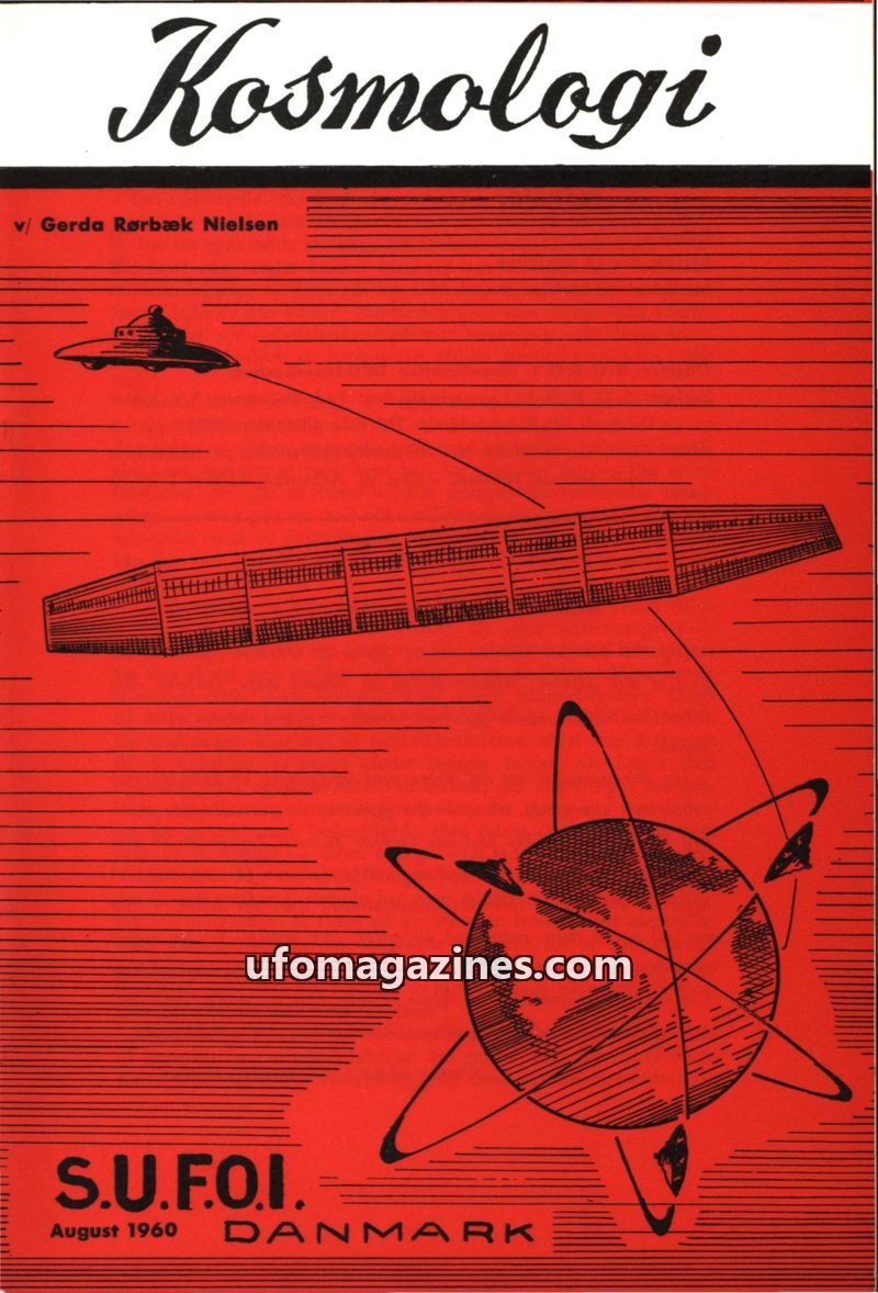 This issue of Kosmologi, published in August 1960 by S.U.F.O.I. in Denmark, features articles on cosmology, UFOs, and human development. The editor, Gerda Rørbæk Nielsen, announces