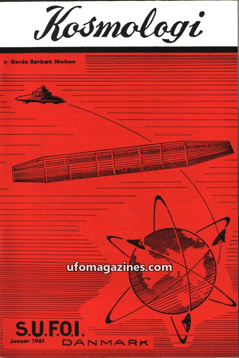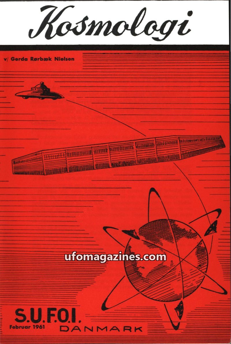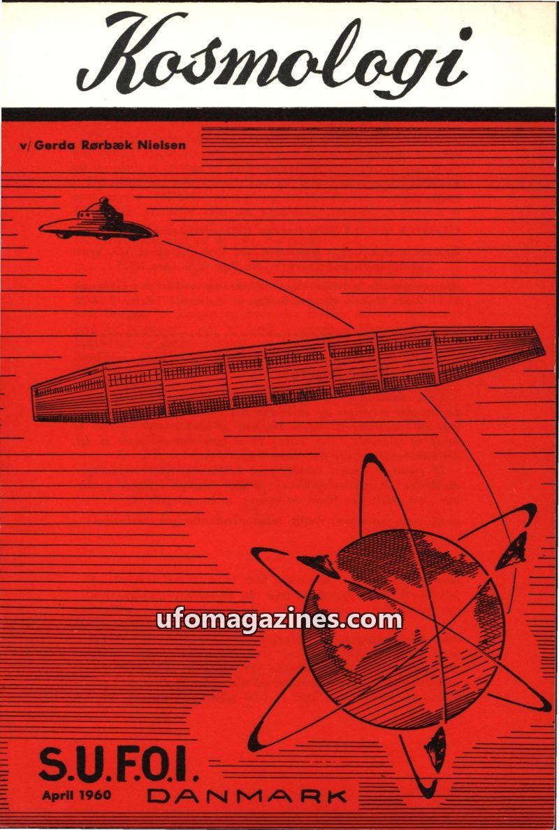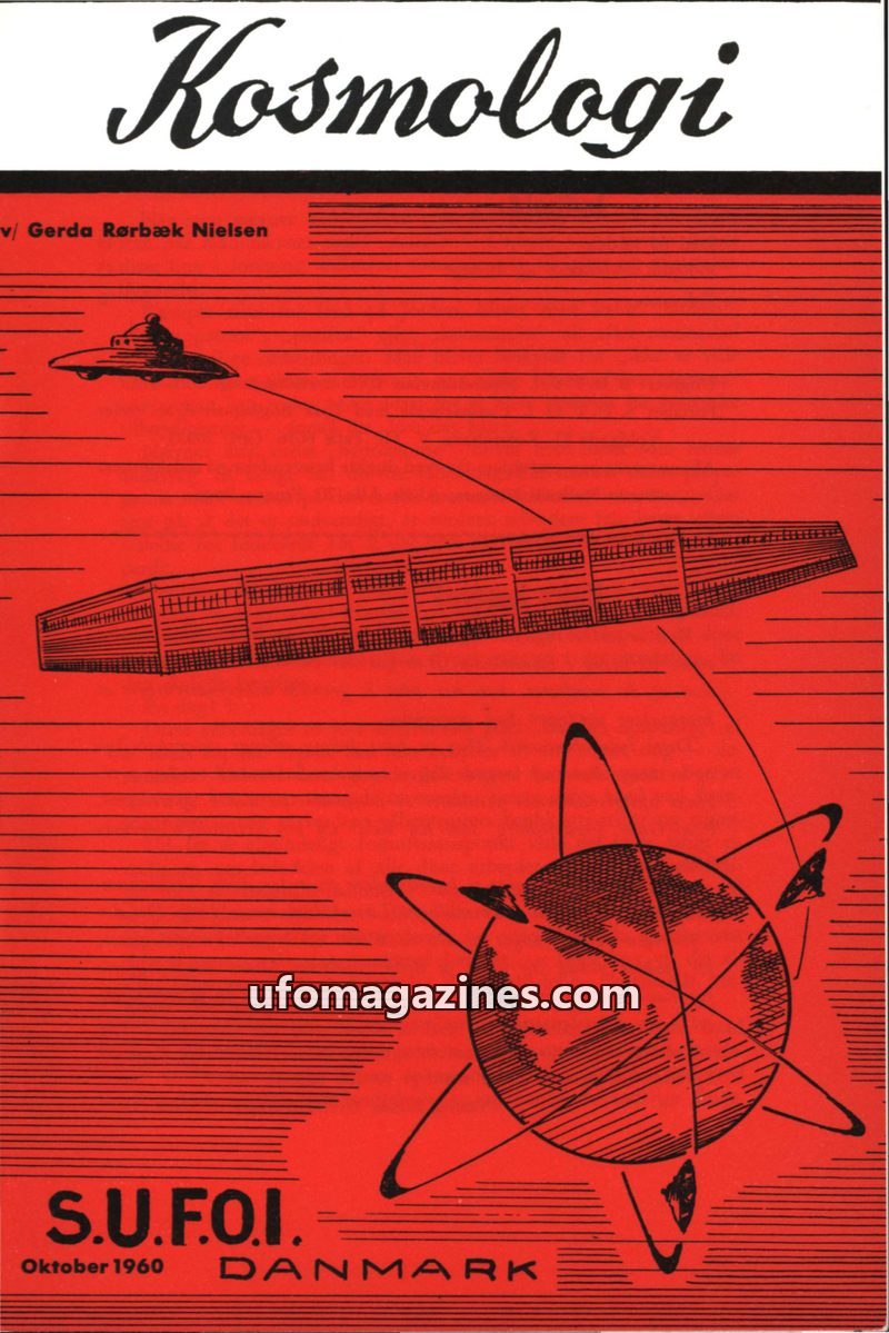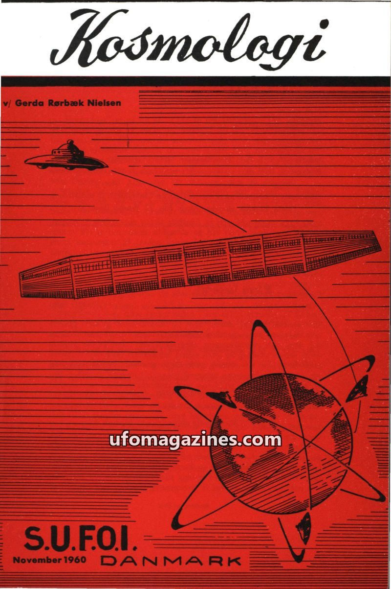 This issue of Kosmologi, published in August 1960 by S.U.F.O.I. in Denmark, features articles on cosmology, UFOs, and human development. The editor, Gerda Rørbæk Nielsen, announces