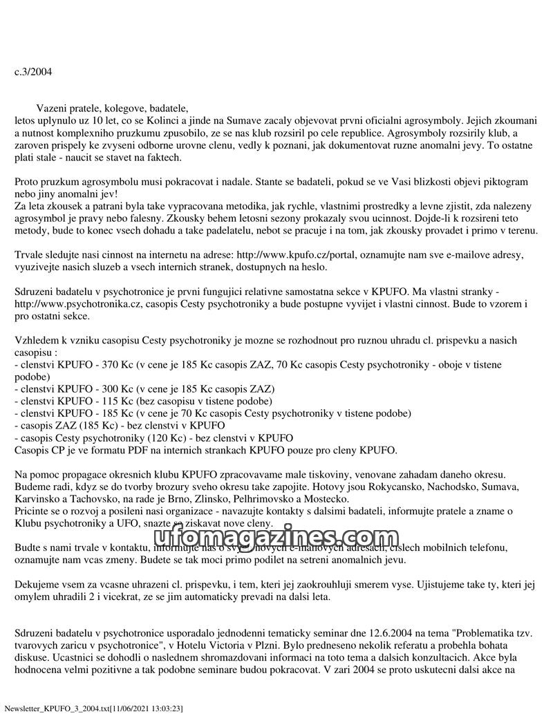 This issue of Newsletter KPUFO (3/2004) focuses on the ongoing research into agrosymbols, marking 10 years since their first official appearance. It details membership options, sub