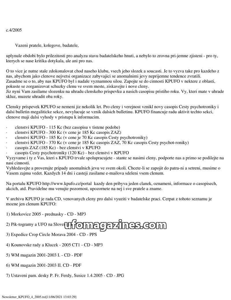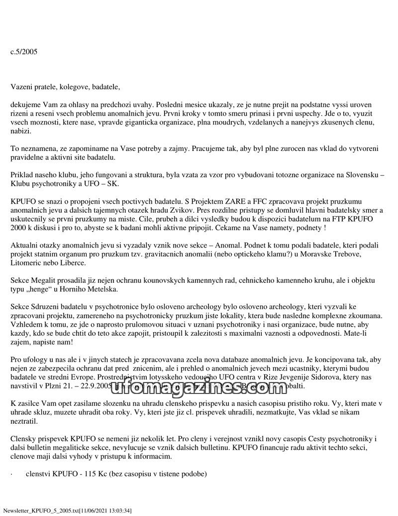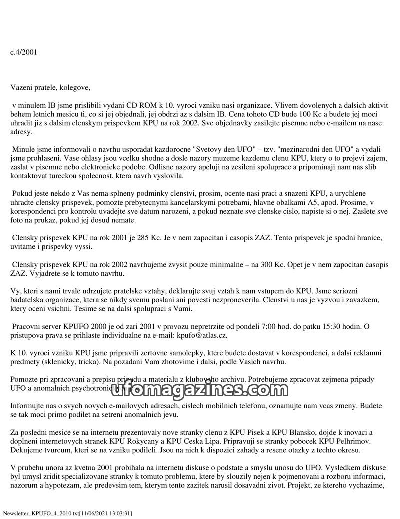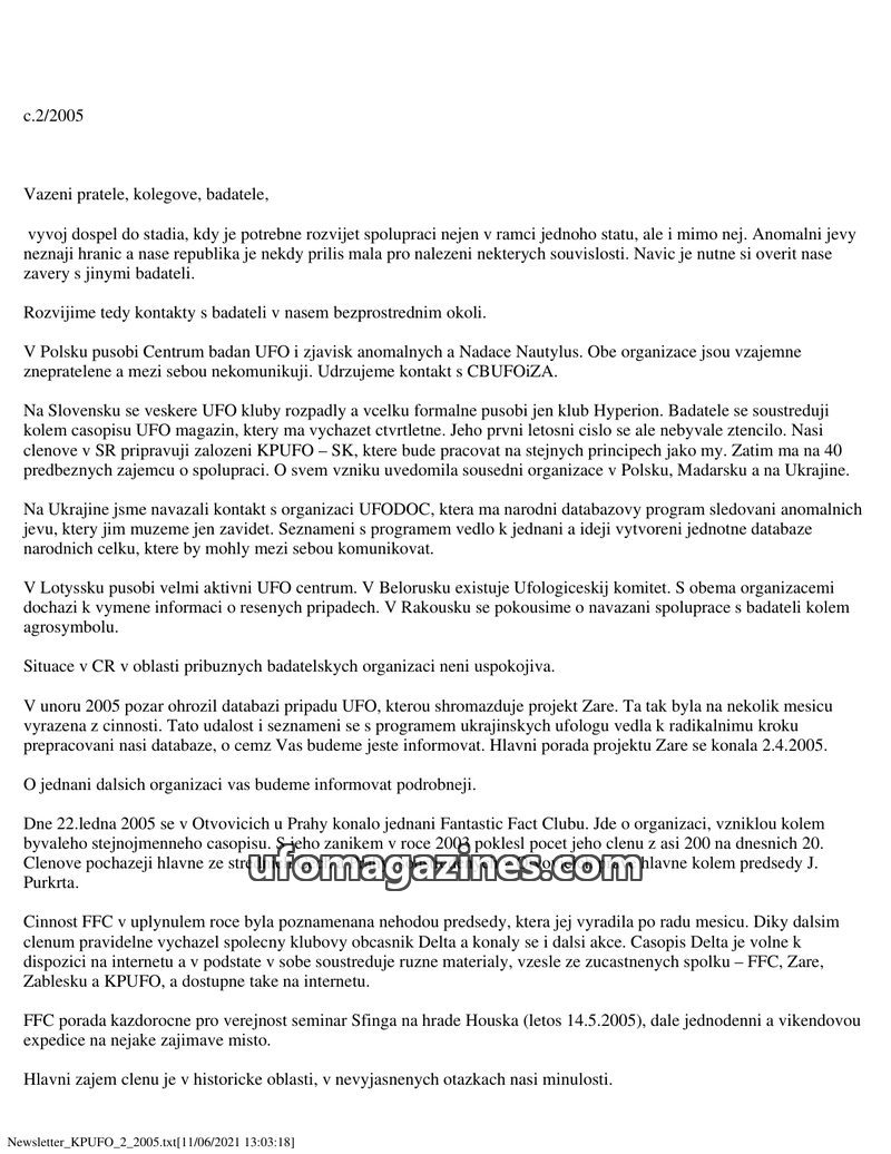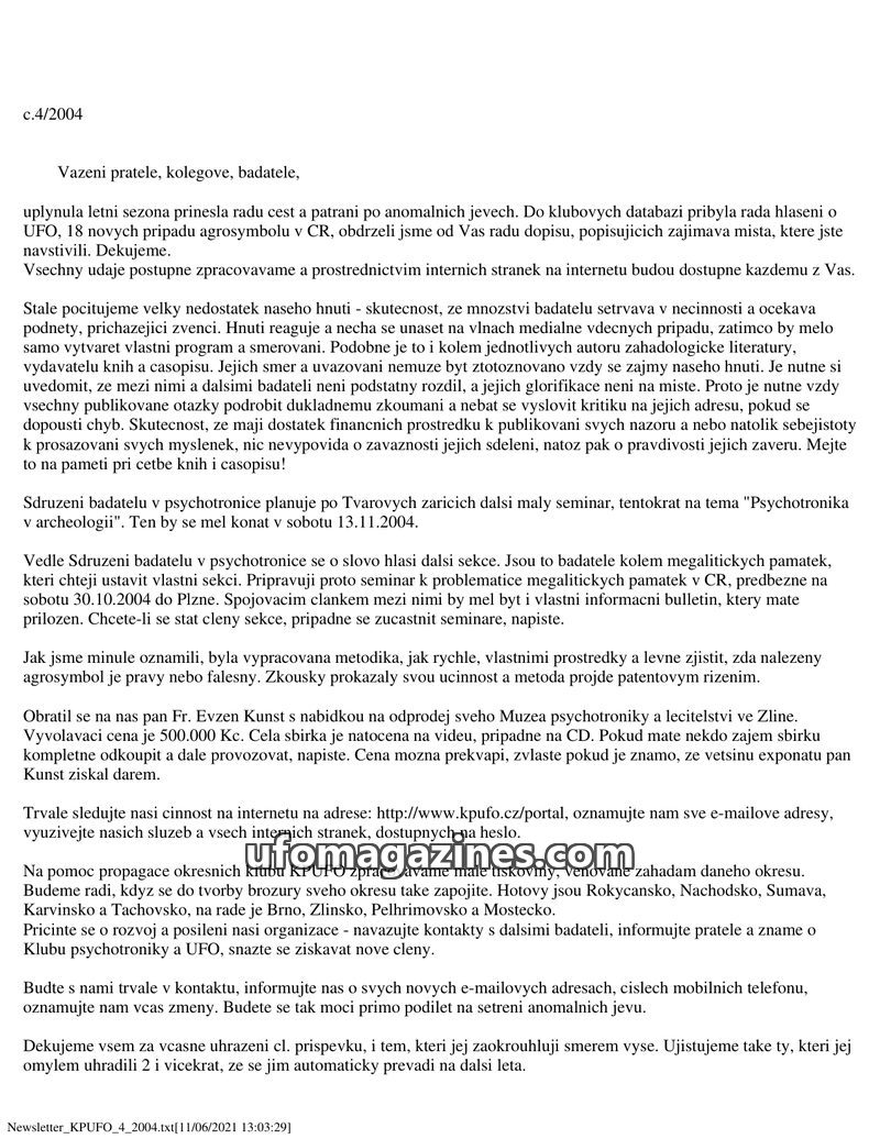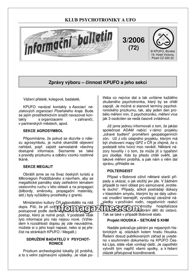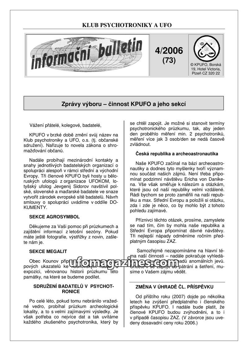 This issue of the KPUFO bulletin announces a name change for the organization to Klub psychotroniky a UFO, o.s. It highlights ongoing international contacts and cooperation efforts