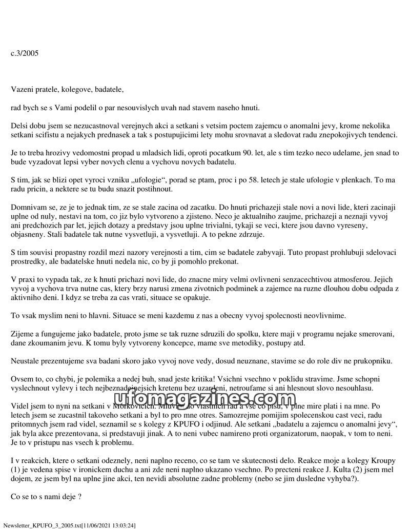 The newsletter addresses the current state of anomalous phenomena research, emphasizing the need for improvement and broader collaboration within the KPUFO club and with internatio
