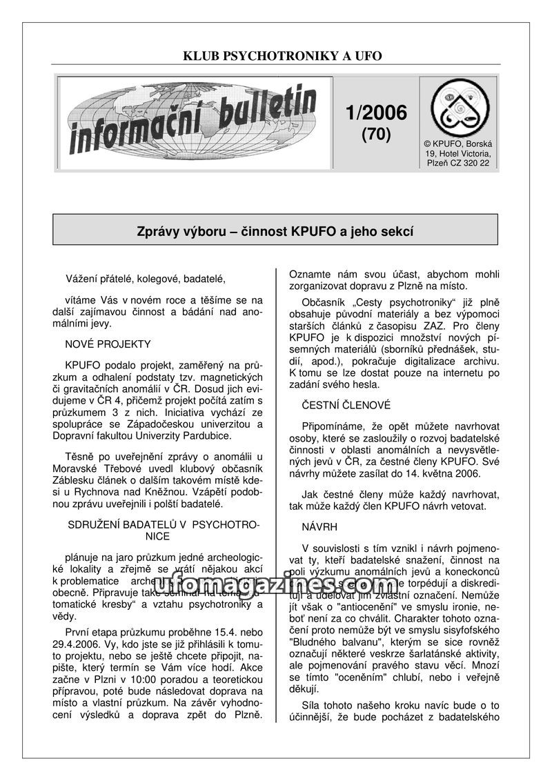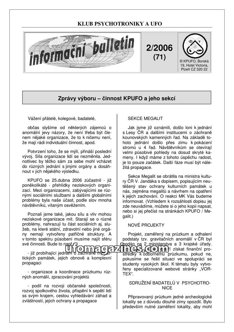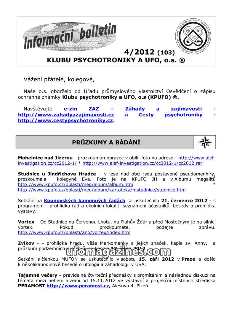 This issue of the KPUFO Information Bulletin details ongoing research projects, including an investigation into magnetic and gravitational anomalies in the Czech Republic, in colla