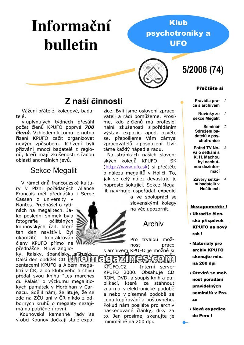 This issue of the Informační bulletin from Klub psychotroniky a UFO (KPUFO) highlights the organization's activities and research. The number of KPUFO members has exceeded 700, nec