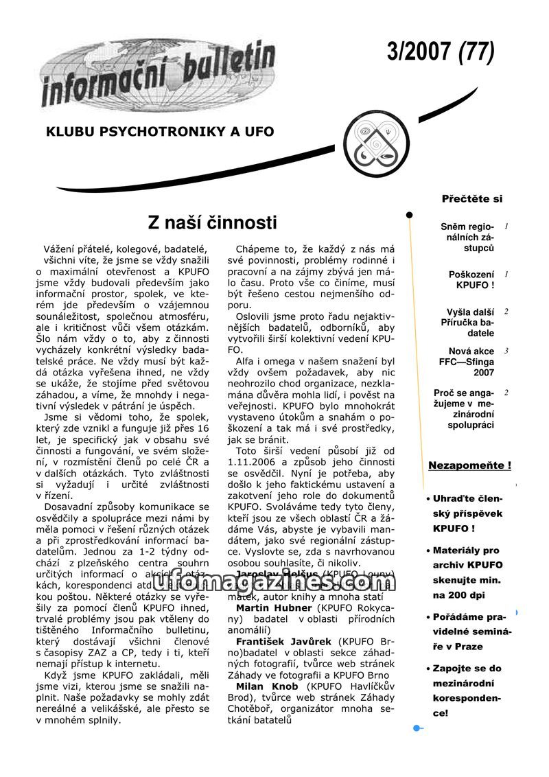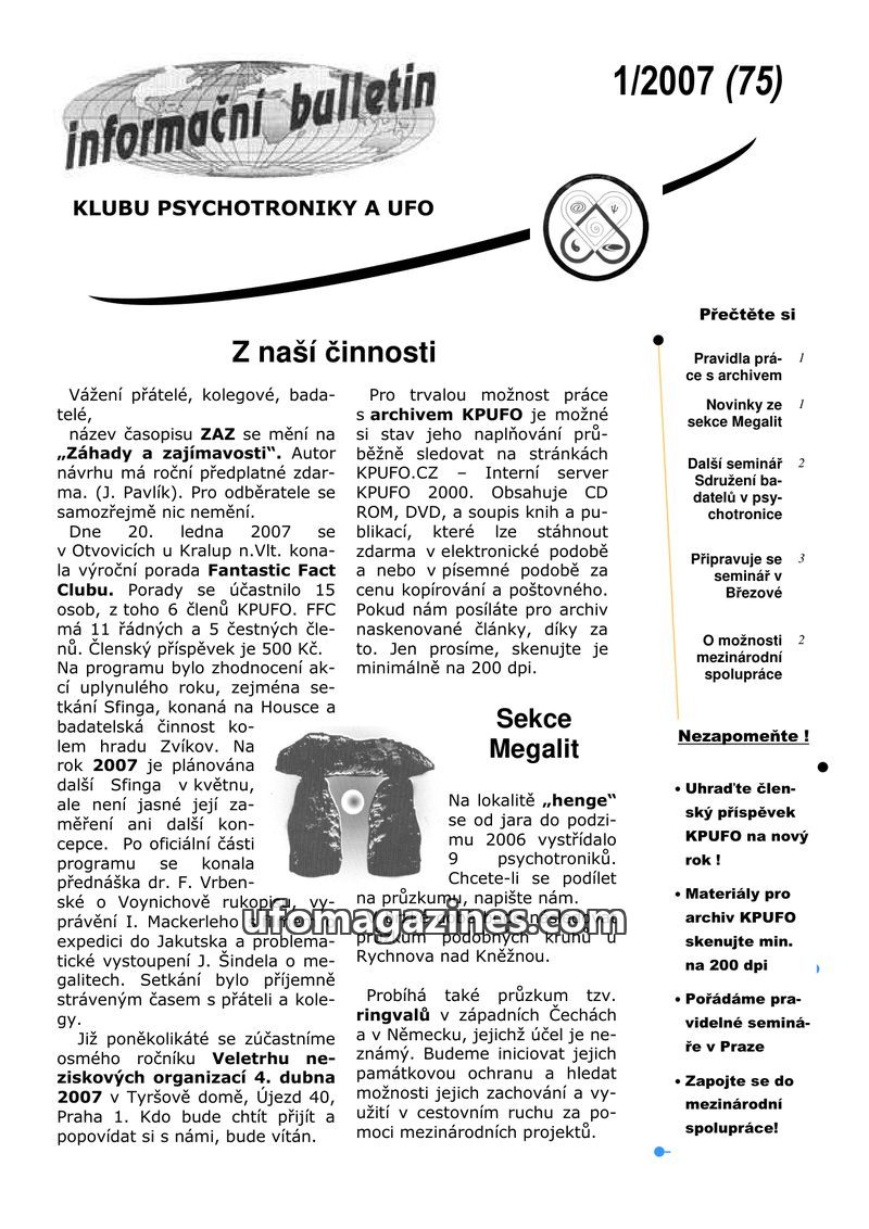 This issue of the KPUFO bulletin (1/2007, issue 75) details the club's activities, including a name change for the ZAZ magazine to 'Záhady a zajímavosti' and upcoming events like t