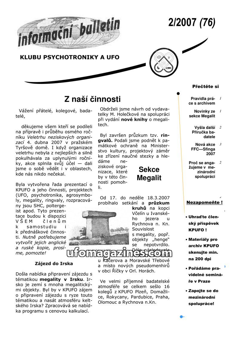 This issue of the KPUFO bulletin details the organization's activities and its various sections. It highlights efforts to build international contacts, promote megalithic sites, an