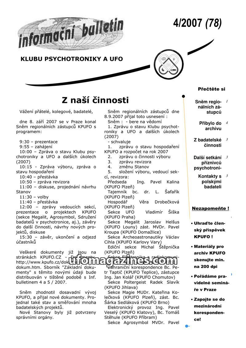 The KPUFO (Club of Psychotronics and UFO) held its regional representatives' meeting on September 8, 2007, in Prague. The meeting approved the club's financial report, budget, and