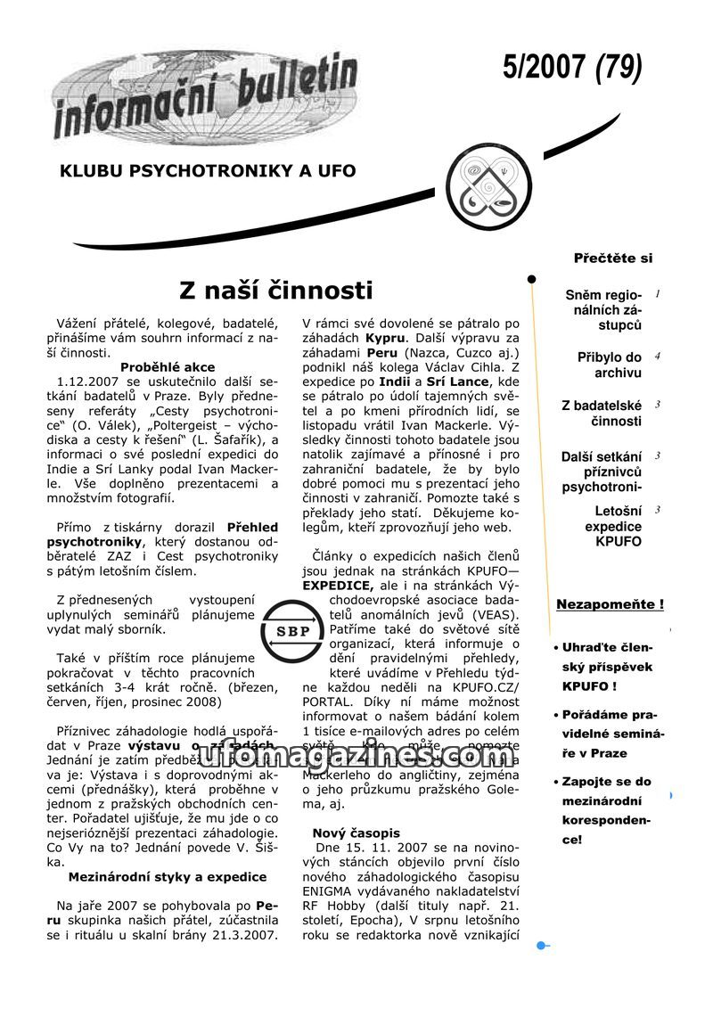 This issue of the Informační bulletin from the Club of Psychotronics and UFO (KPUFO) details recent activities, including meetings, lectures, and expeditions. Members traveled to P