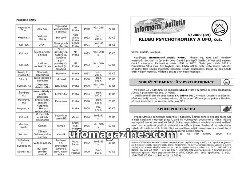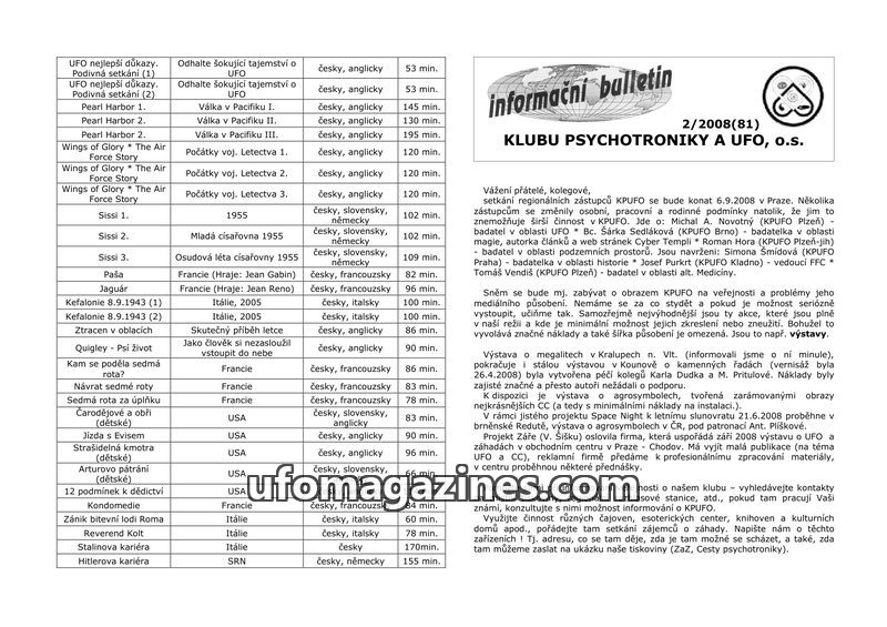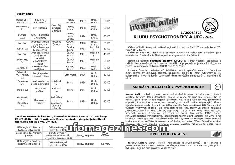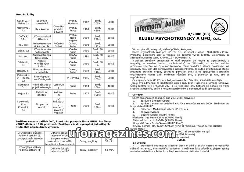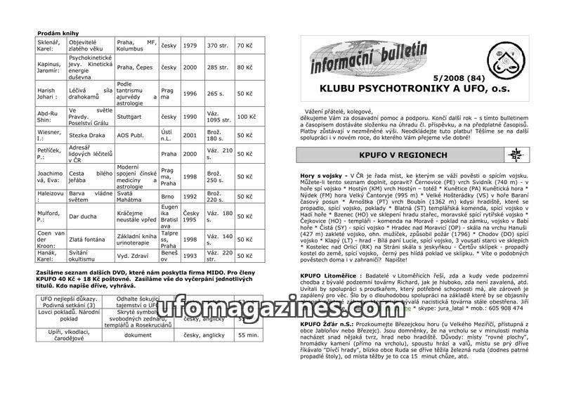 This issue of the KPUFO bulletin (5/2008) includes a list of books for sale, information on upcoming KPUFO events in Havlíkův Brod and Česká Skalice, and a mention of a past psycho