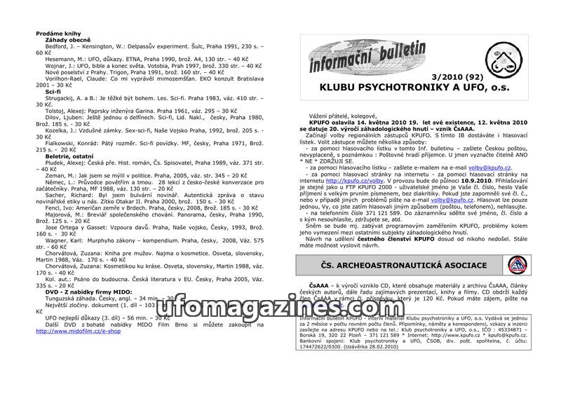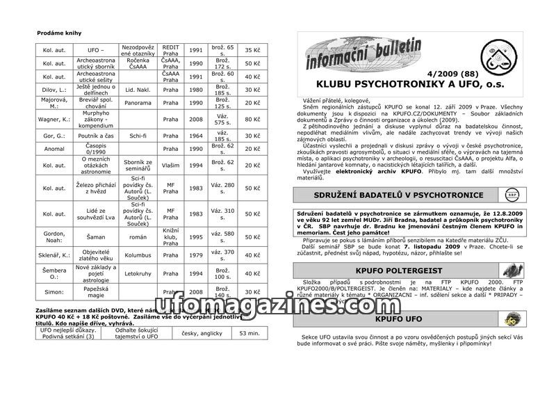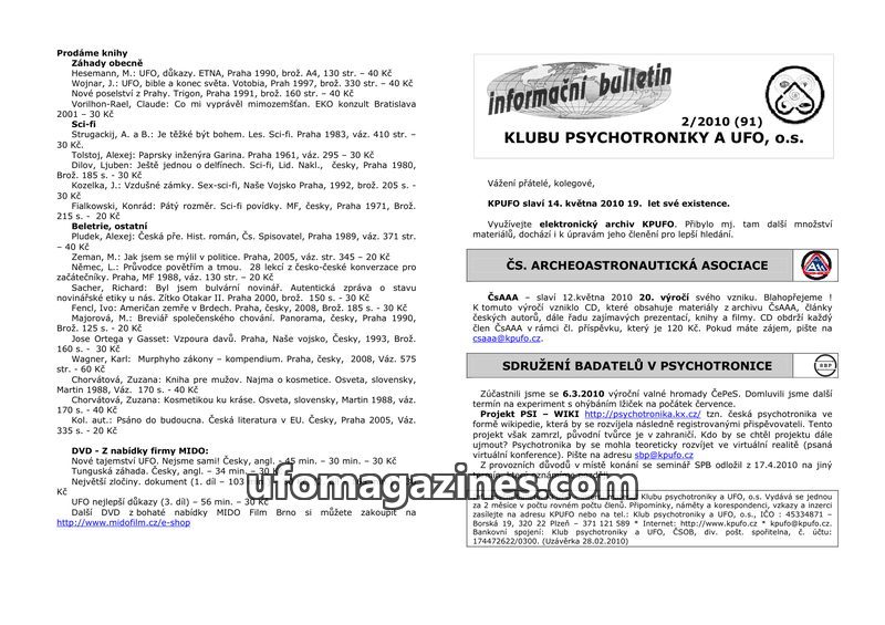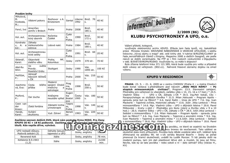 This issue of the KPUFO bulletin celebrates the 19th anniversary of the club and the 20th anniversary of the Czech Archaeoastronautical Association. It includes a sales list of boo