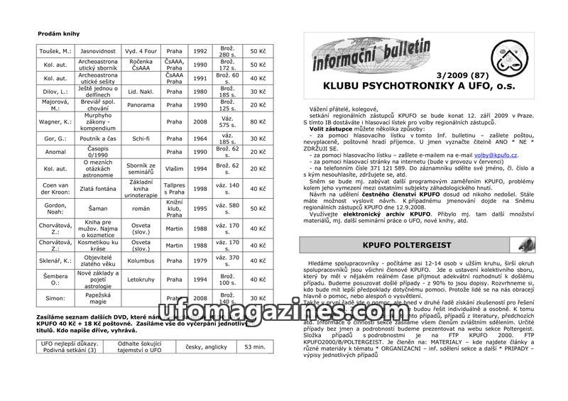 This issue of the KPUFO bulletin (3/2009) announces a regional representative meeting and election, providing voting methods. It highlights the KPUFO Poltergeist section seeking co