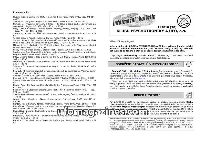 This issue of the KPUFO bulletin from January 2010 announces the archiving of KPUFO.CZ and PSYCHOTRONIKA.CZ by the National Library of the Czech Republic. It details an upcoming se