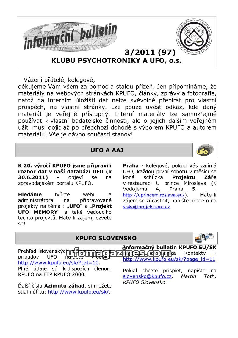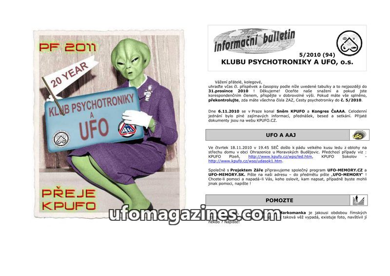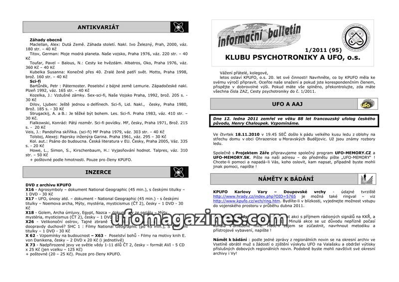 This issue of the 'informační bulletin' from Klub psychotroniky a UFO, o.s. (issue 2/2011, #96) celebrates anniversaries of the UFO movement in Czechoslovakia. It seeks a web admin