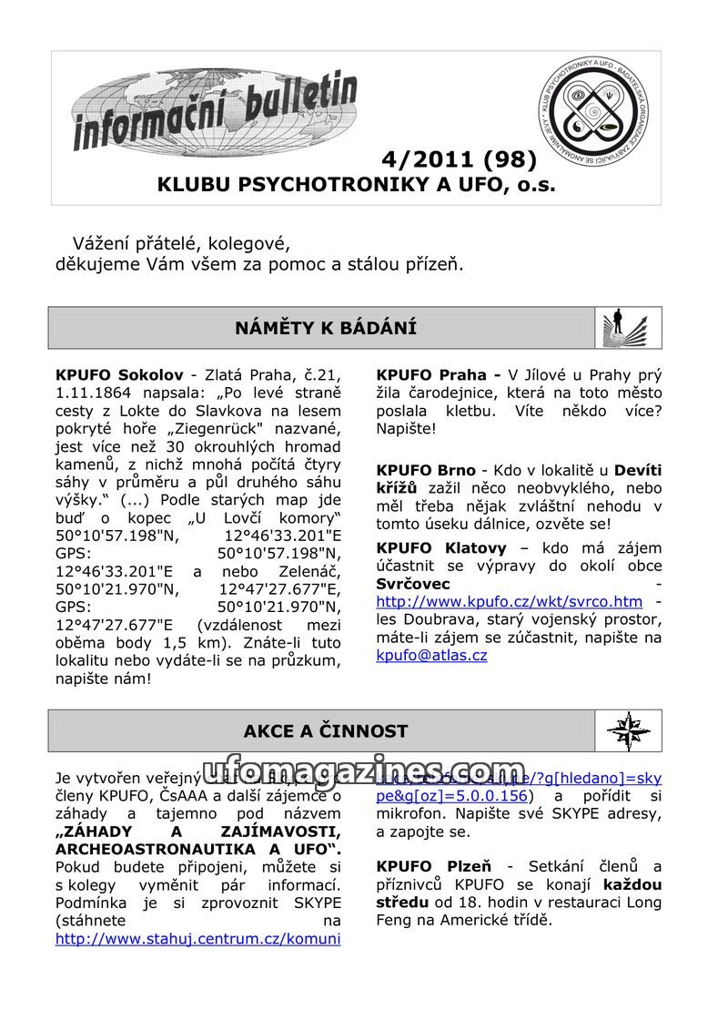 This issue of the 'informační bulletin' from Klub Psychotroniky a UFO, o.s. (Issue 4/2011, number 98) calls for research into historical anomalies, such as stone heaps near Lokte,