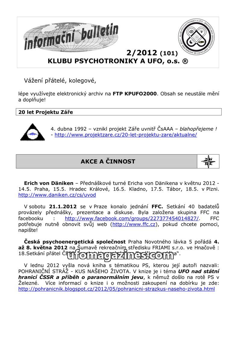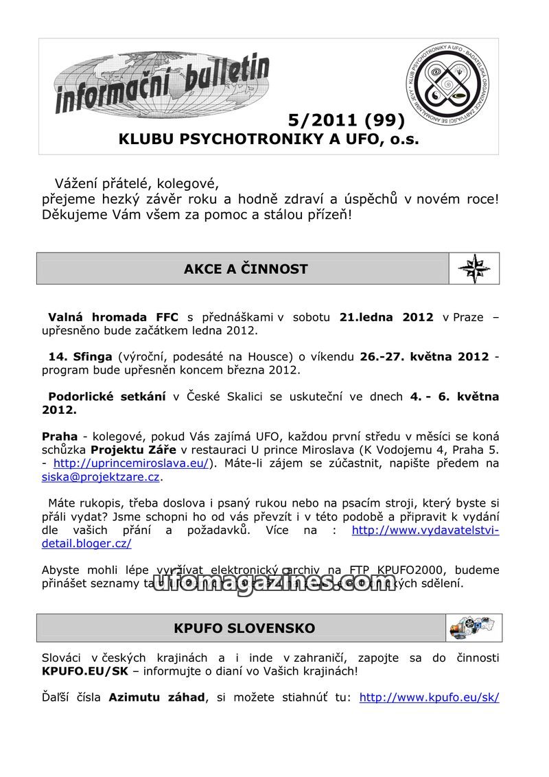 This issue of the Informacni Bulletin from Klub Psychotroniky a UFO, o.s. announces upcoming events such as the FFC general assembly in Prague on January 21, 2012, the 'Sfinga' eve