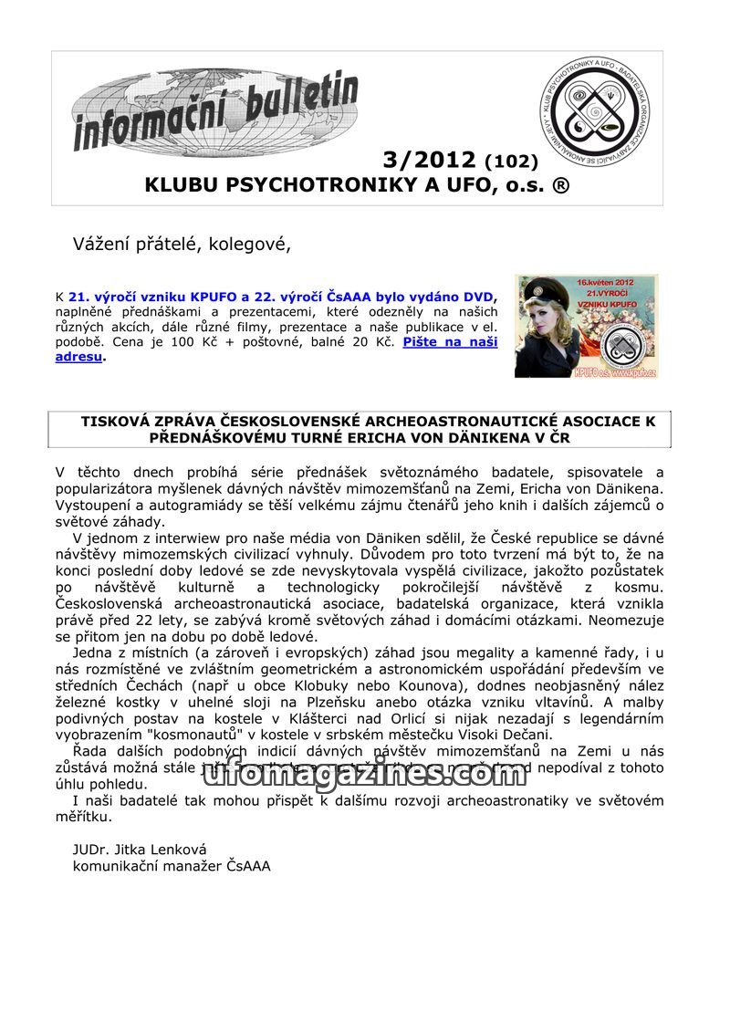 This issue of the Informační Bulletin from Klub Psychotroniky a UFO (KPUFO) announces a DVD compilation of past lectures and presentations. It features a press release about Erich