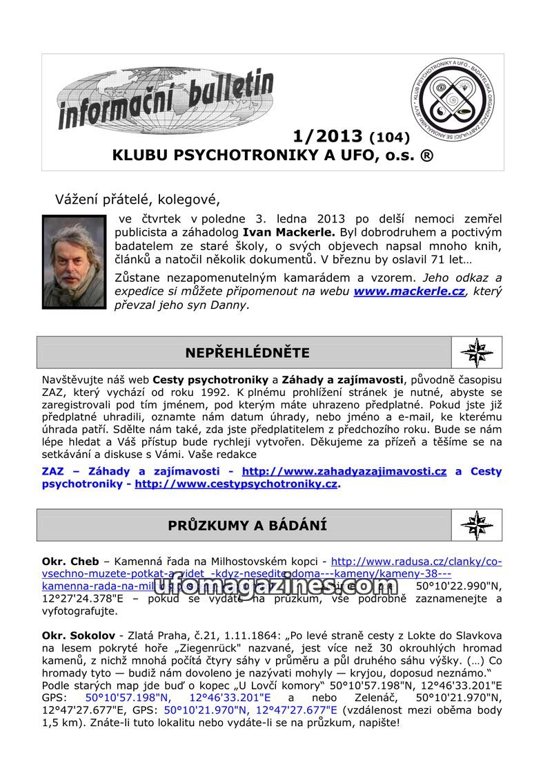 This issue of the Informační bulletin from Klub psychotroniky a UFO, o.s. (1/2013) leads with an obituary for publicist and ufologist Ivan Mackerle, who passed away on January 3, 2