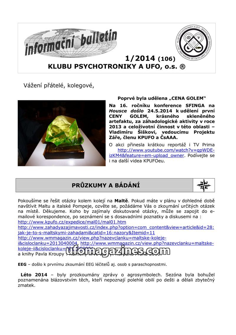 This issue of the KPUFO bulletin (1/2014) highlights the presentation of the first GOLEM AWARD to Vladimír Šiška for his contributions to ufology. It details ongoing investigations