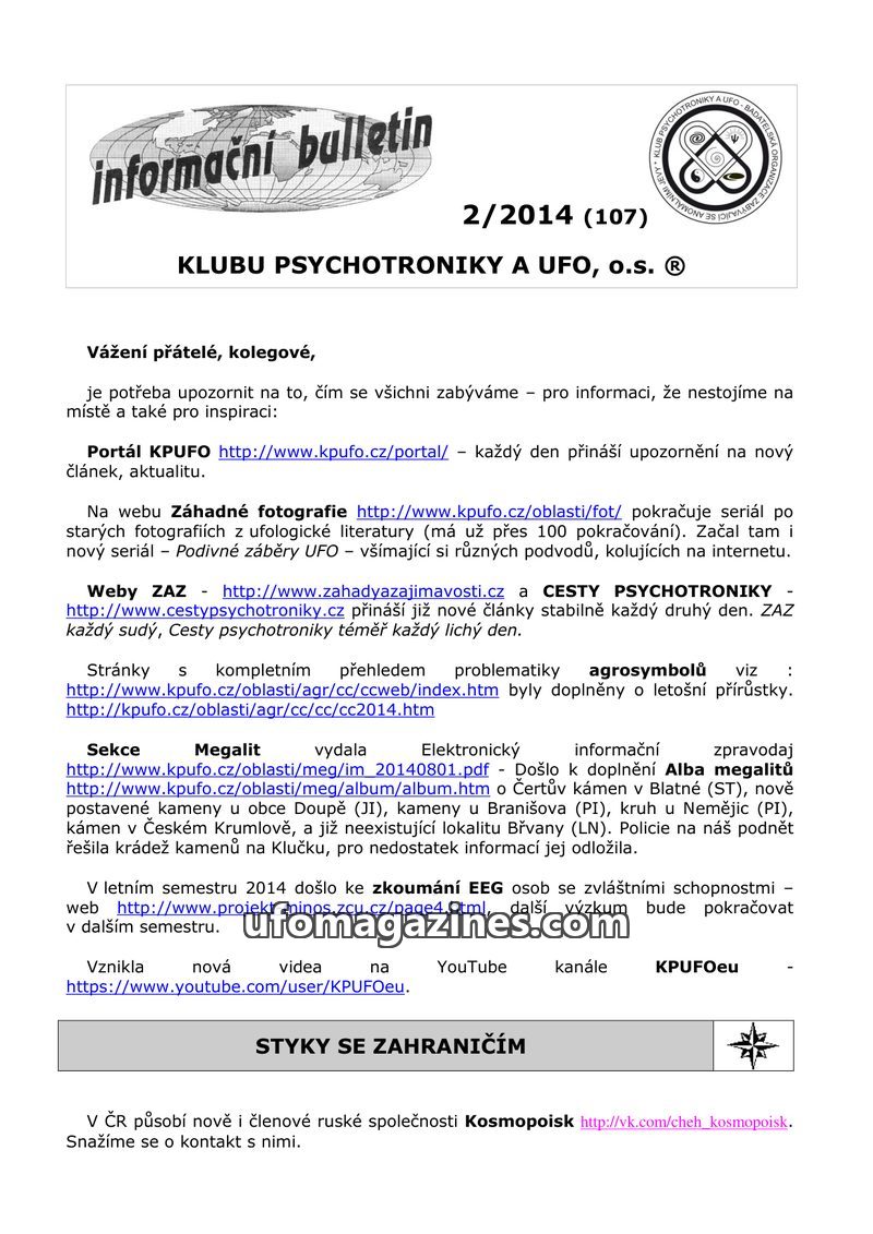 This issue of the Informační bulletin from Klub psychotroniky a UFO, o.s. announces the transition of their magazines 'Záhady a zajímavosti' and 'Cesty psychotroniky' to an online