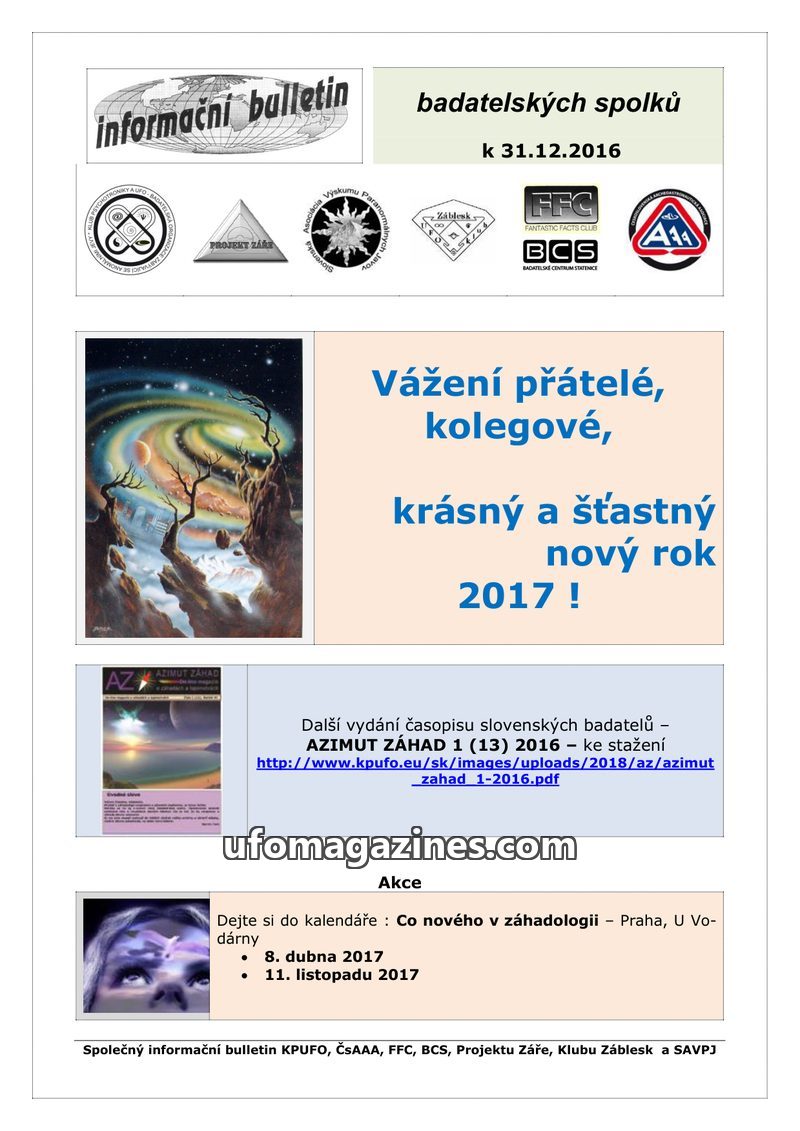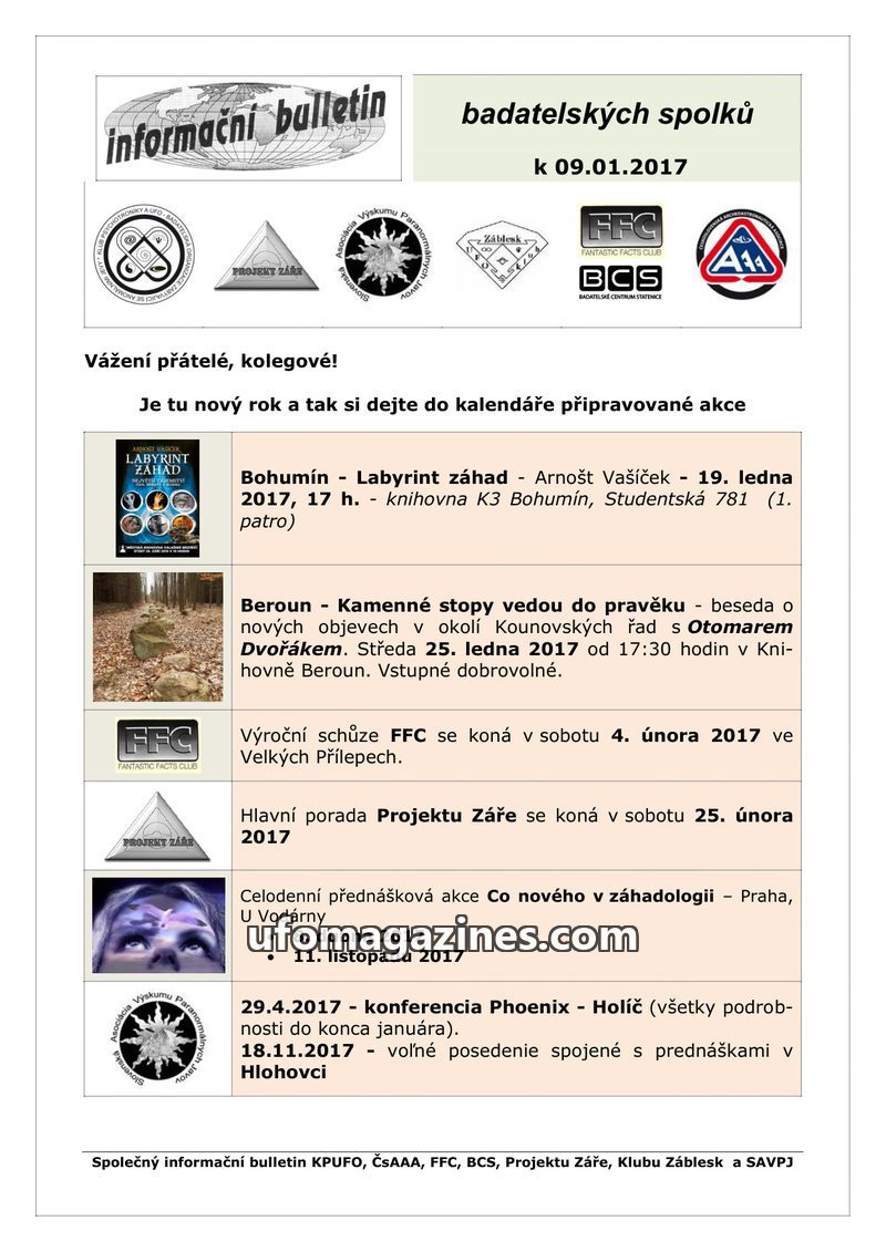 This bulletin announces upcoming events for early 2017 organized by various Czech and Slovak paranormal research groups. Events include lectures on 'Labyrint záhad' in Bohumín on J
