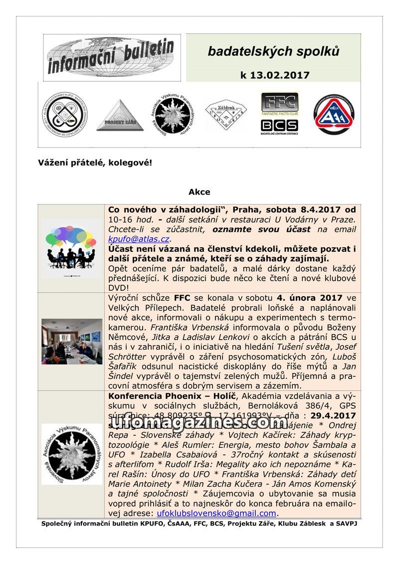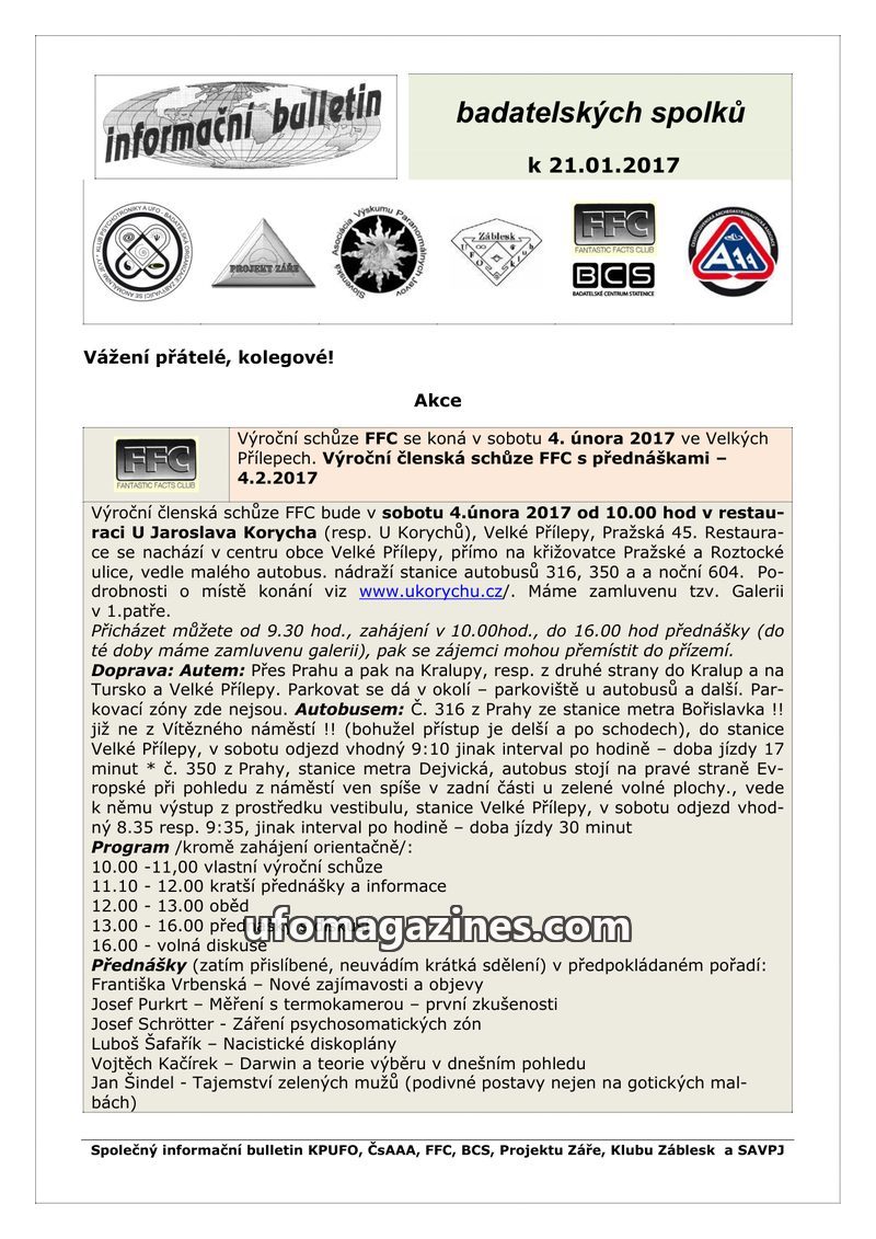 This bulletin from January 21, 2017, announces the annual meeting of the Fantastic Facts Club (FFC) to be held on February 4, 2017, in Velké Přílepy, Czech Republic. The meeting wi