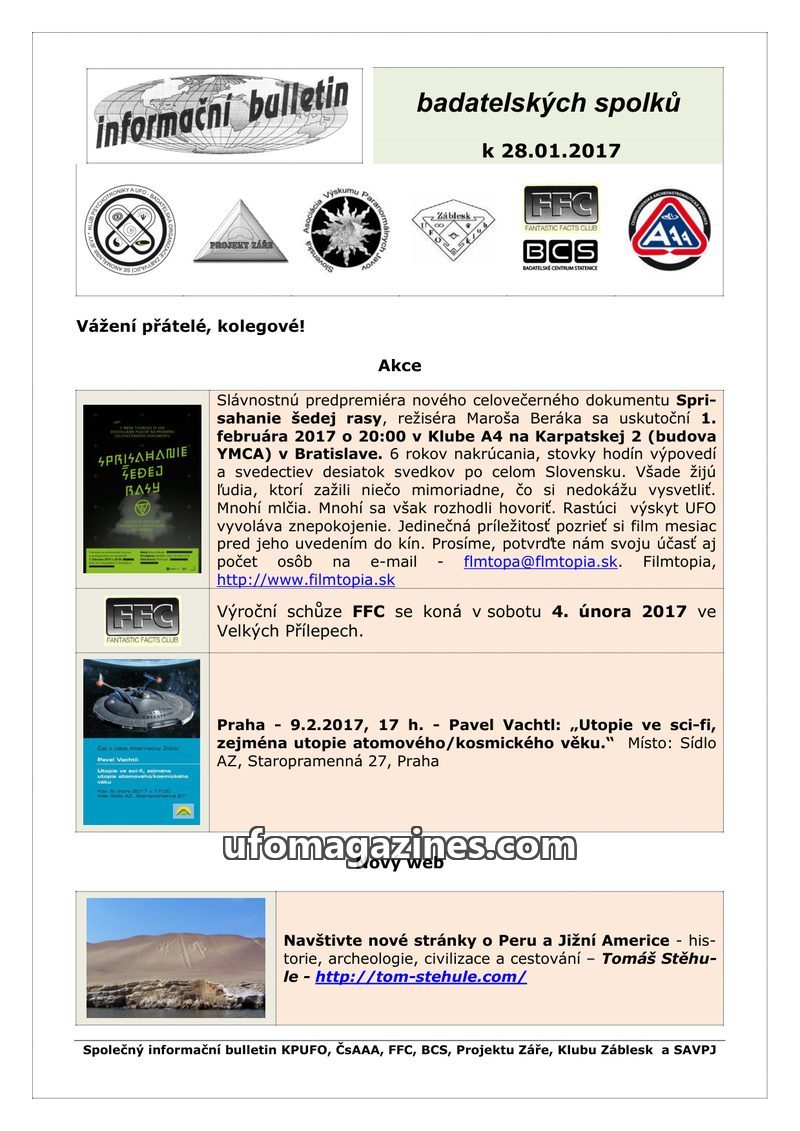 This issue of the 'informační bulletin' from January 28, 2017, announces several upcoming events and new releases. A premiere of the documentary 'Conspiracy of the Grey Race' is sc