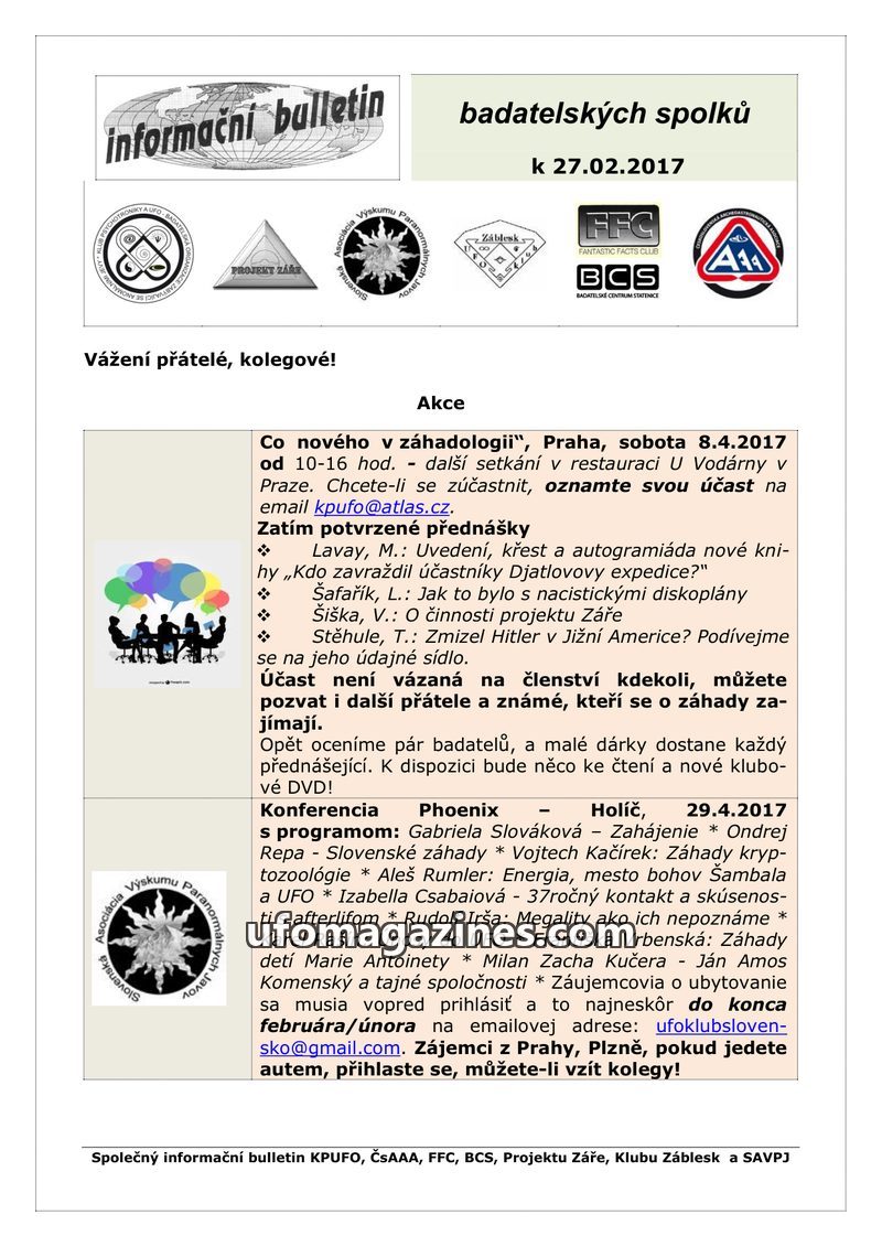This issue of the 'informační bulletin' from February 27, 2017, details upcoming events and resources for enthusiasts of 'záhadologie' (mystery studies). It announces a meeting in
