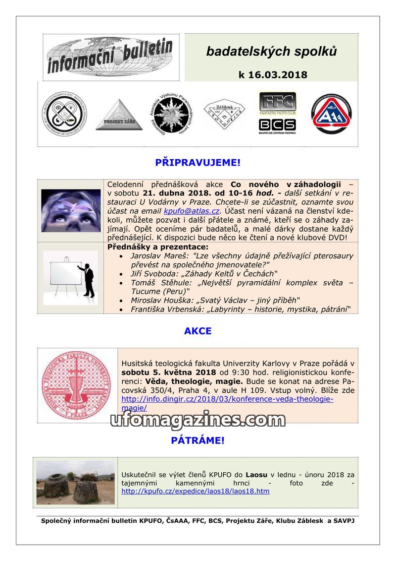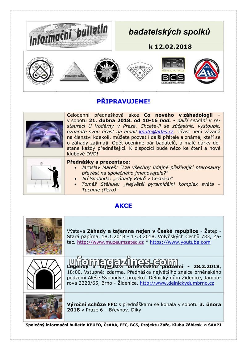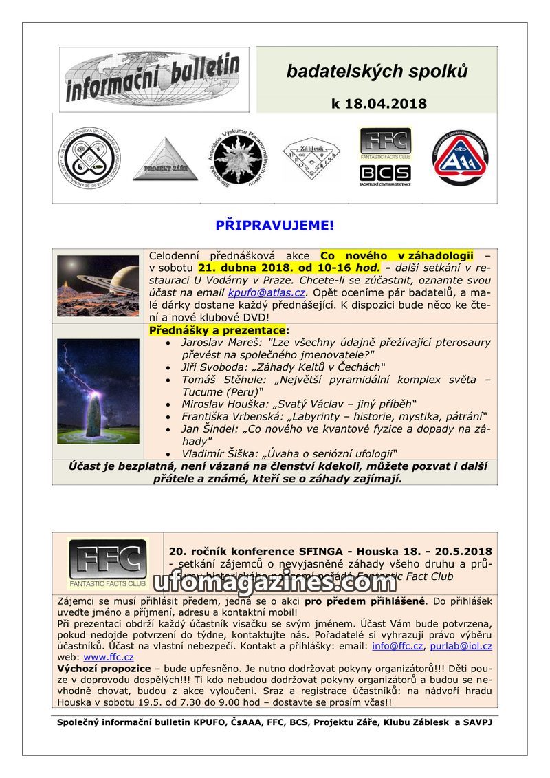 This bulletin announces an upcoming all-day lecture event on 'What's New in Ufology' on April 21, 2018, in Prague, featuring talks on surviving pterosaurs, Celtic mysteries, the Tu