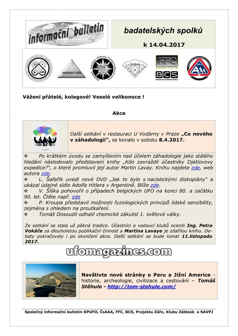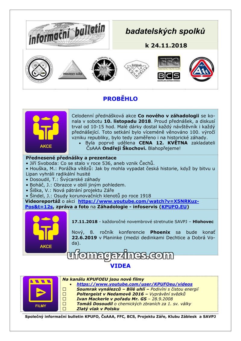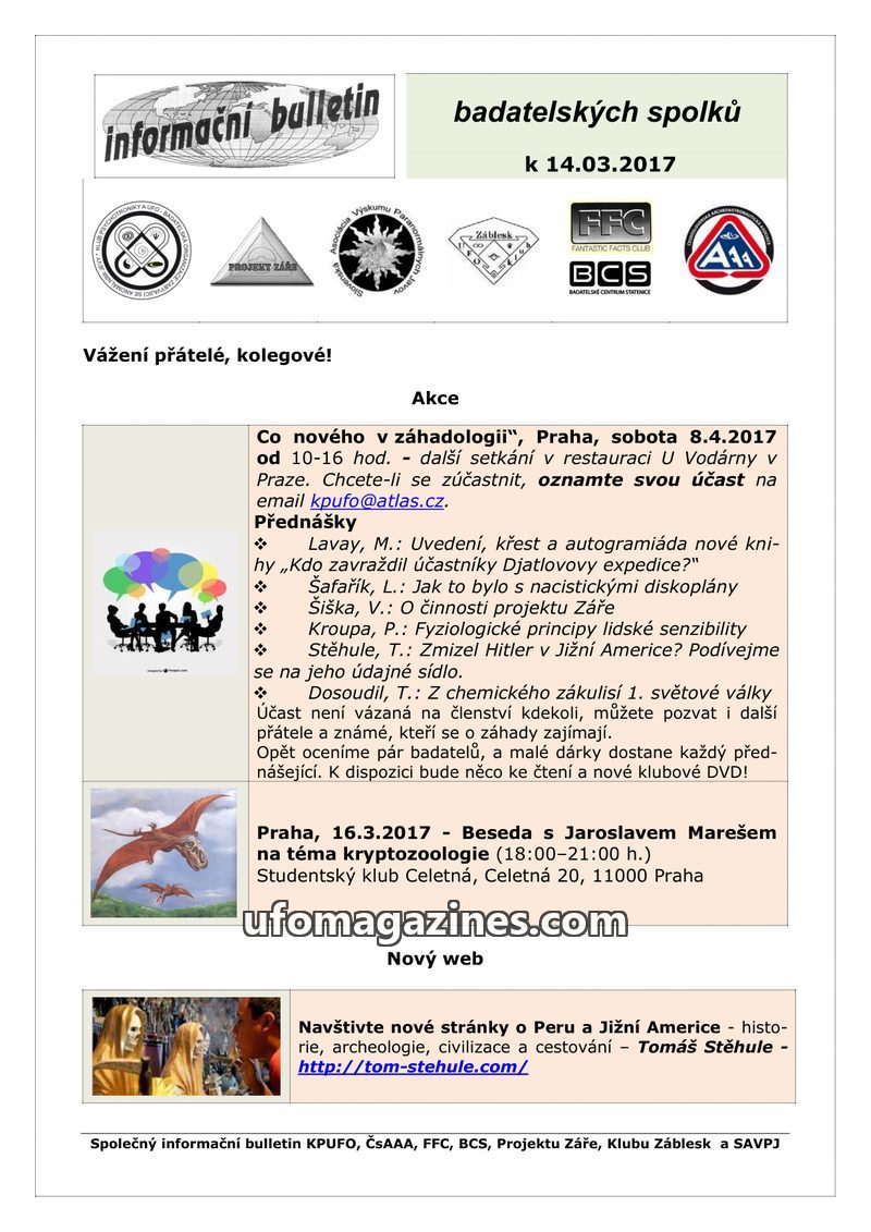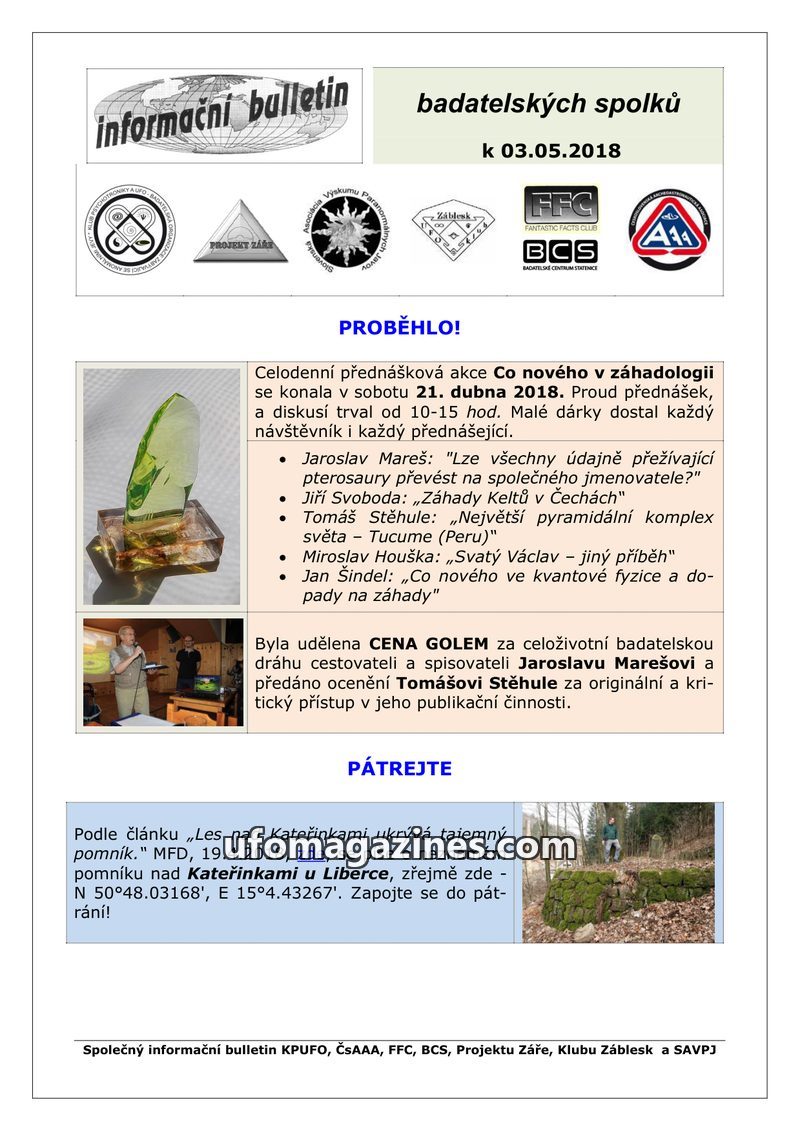 This bulletin announces an upcoming all-day lecture event on 'What's New in Ufology' on April 21, 2018, in Prague, featuring talks on surviving pterosaurs, Celtic mysteries, the Tu