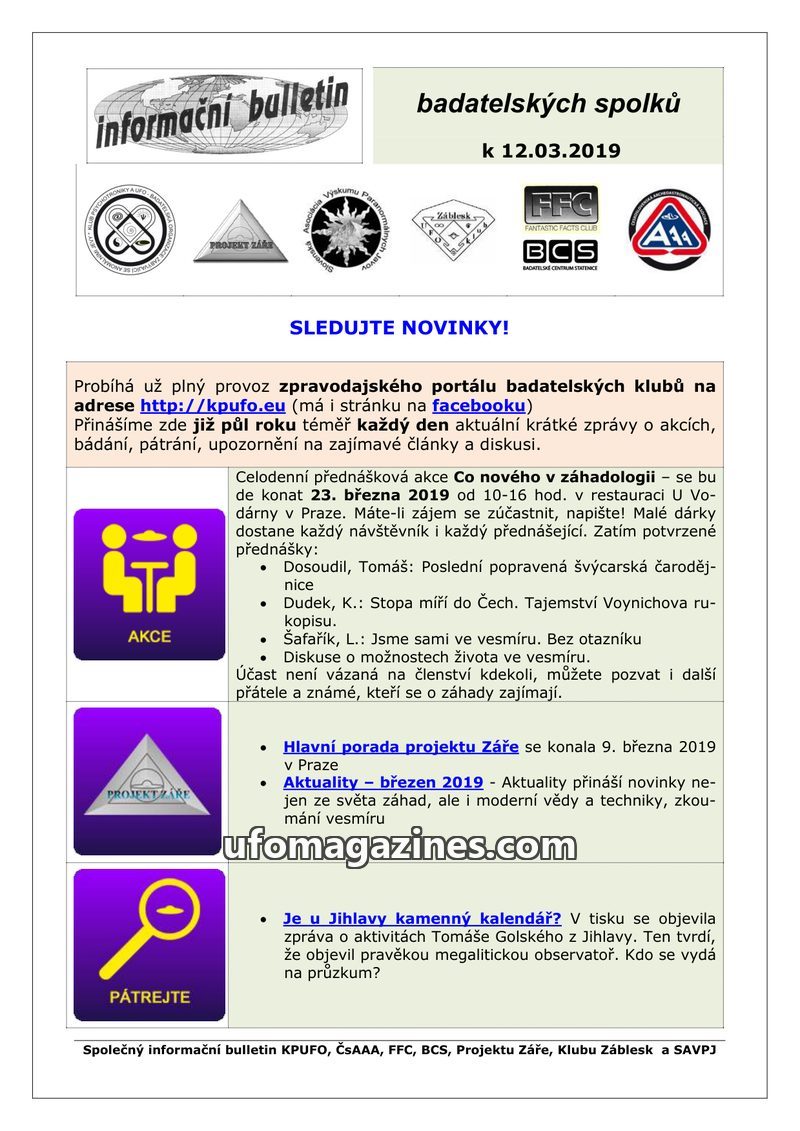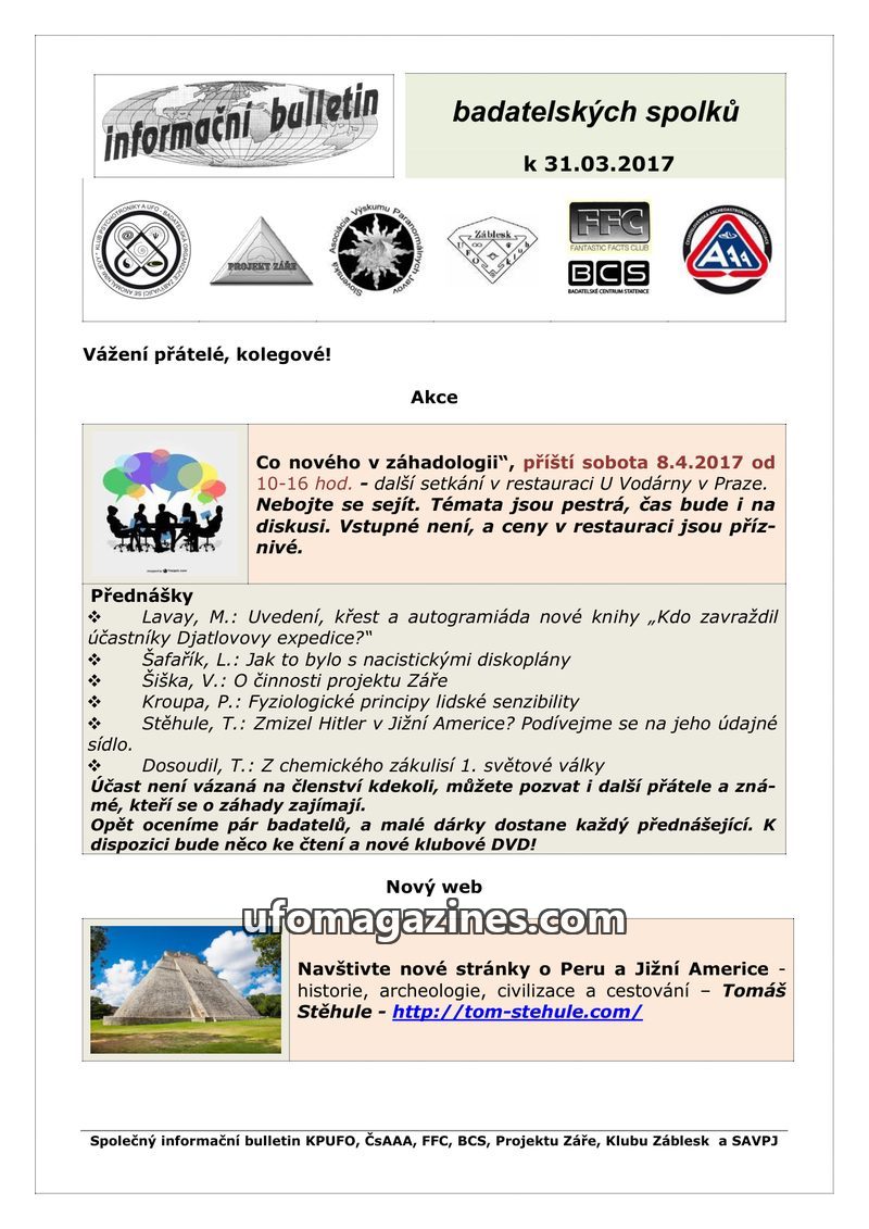This issue of the 'informační bulletin' announces upcoming events and past activities of various research groups. A meeting titled 'Co nového v záhadologii' is scheduled for April