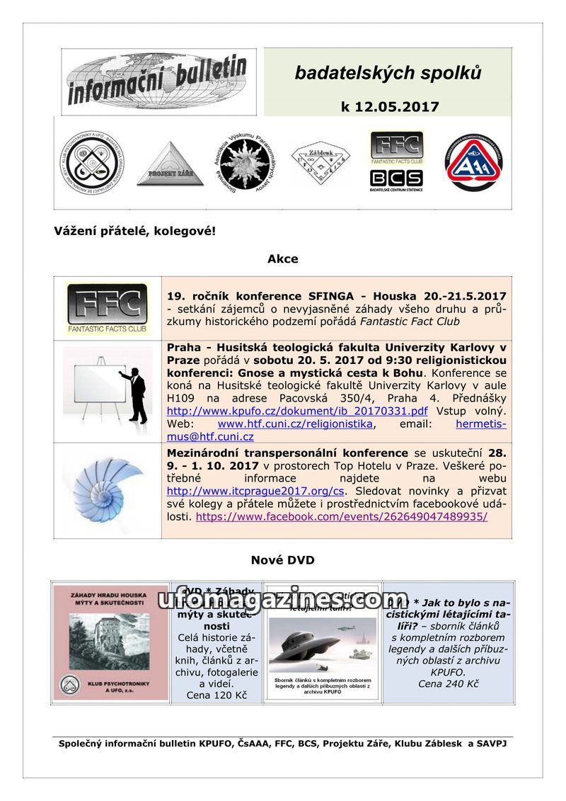 This bulletin announces several upcoming events and new releases from various Czech research organizations. The 19th SFINGA conference on unexplained phenomena will be held at Hous