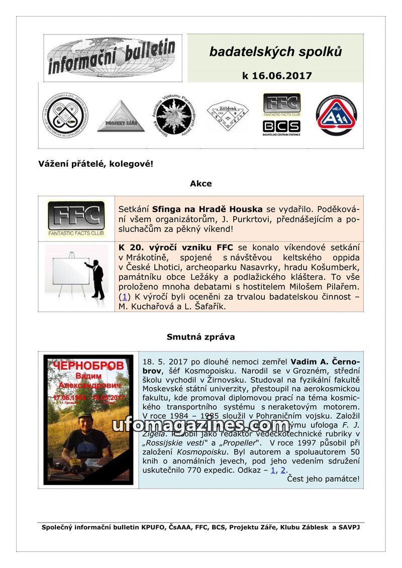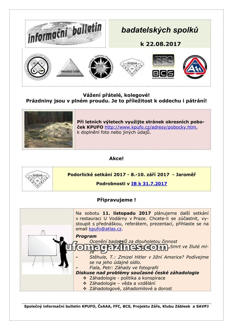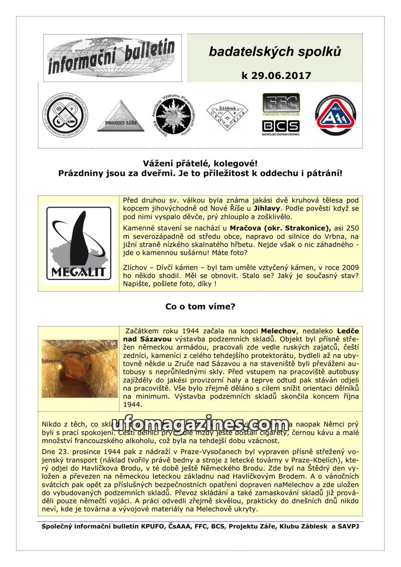 This issue of the 'informační bulletin' from June 29, 2017, covers various topics of interest to paranormal and historical research groups. It includes a report on the secret const