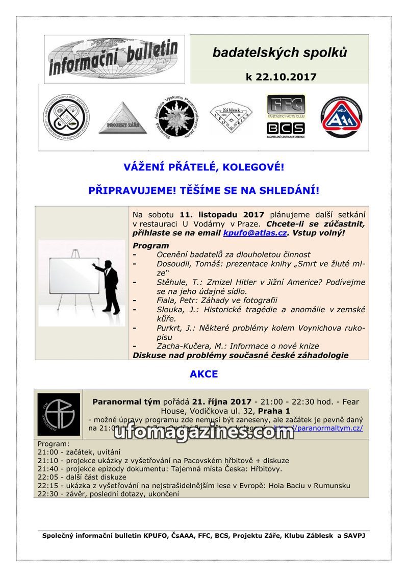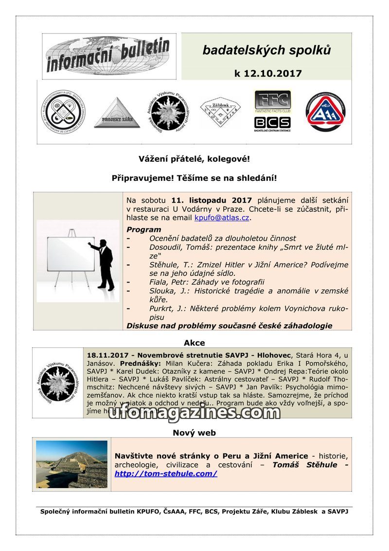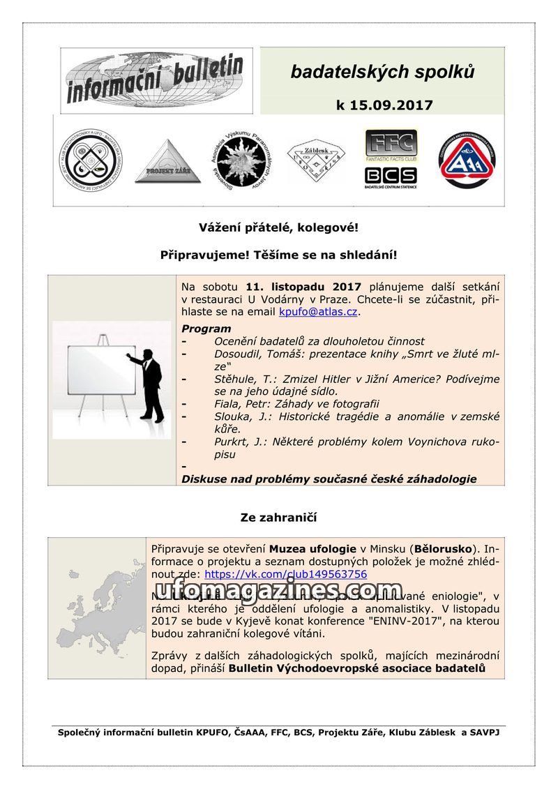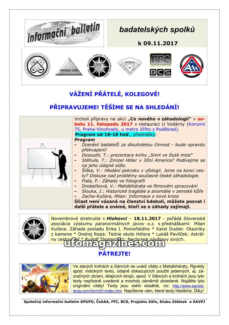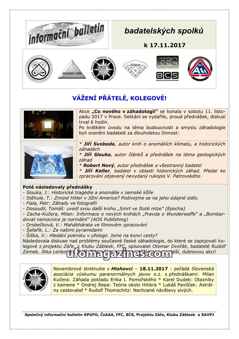 This bulletin announces upcoming events in November 2017: a conference in Prague on "What's New in Ufology" on November 11th, and a meeting in Hlohovec, Slovakia, on November 18th,