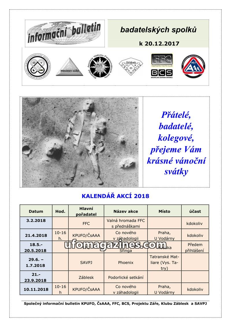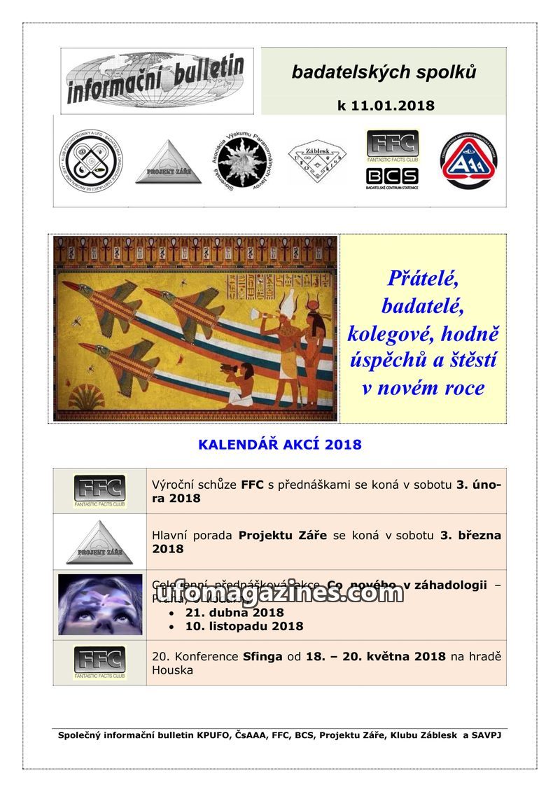 This bulletin announces the 2018 event calendar for various Czech and Slovak research organizations, including FFC, Projektu Záře, and KPUFO. It highlights upcoming conferences, me