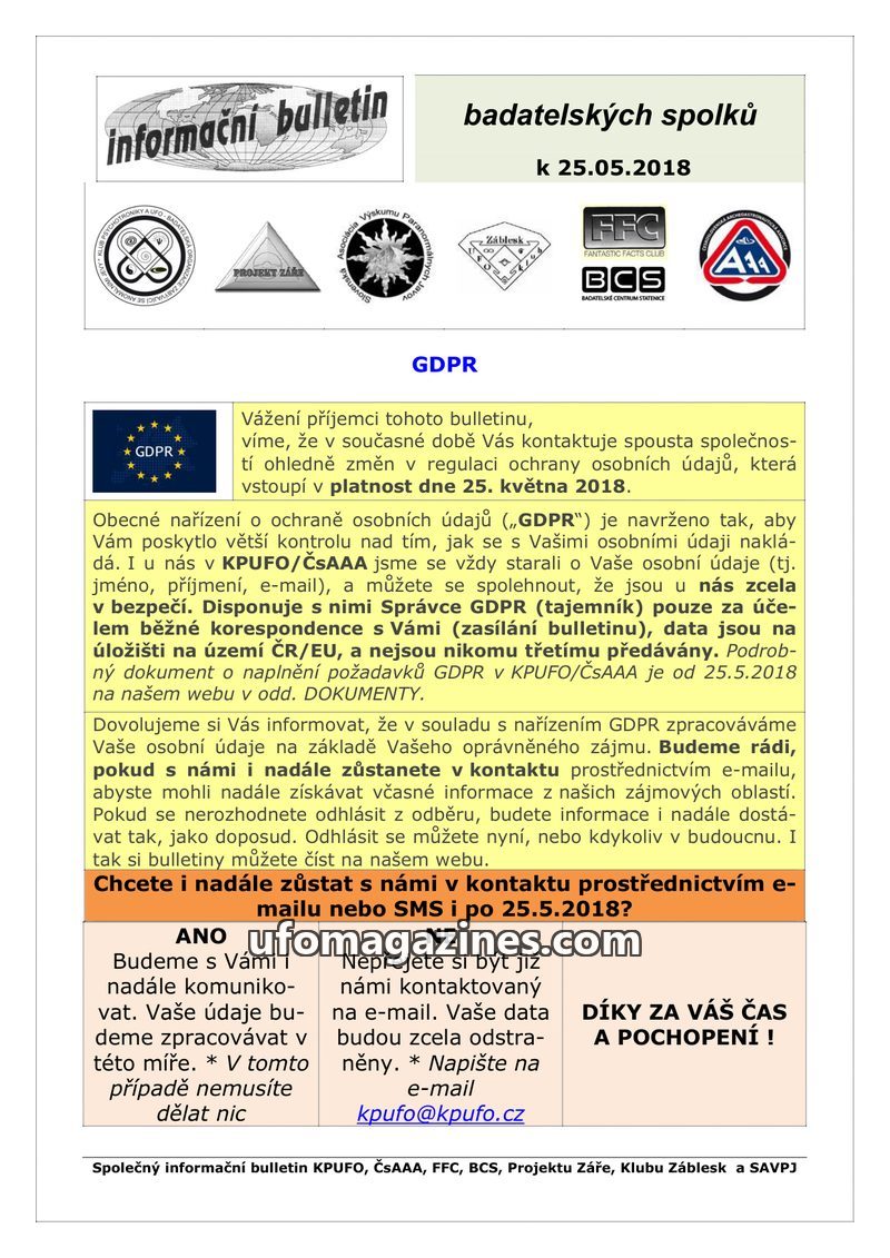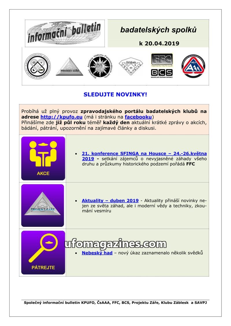 This issue of the 'informační bulletin' highlights the ongoing operation of the KPUFO news portal and its Facebook page, which daily provides updates on research, events, and discu