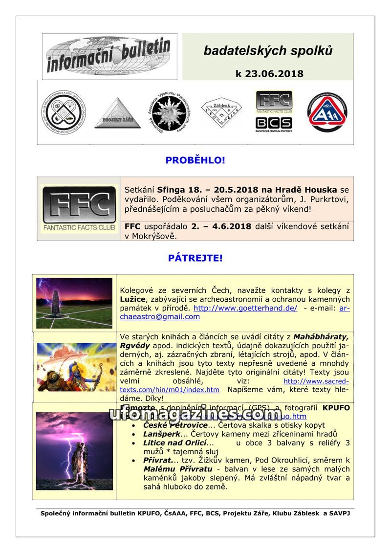 This bulletin from June 23, 2018, highlights recent meetings of research groups like FFC at Hrad Houska and in Mokrýšov. It directs readers to new websites on Peru, South America,