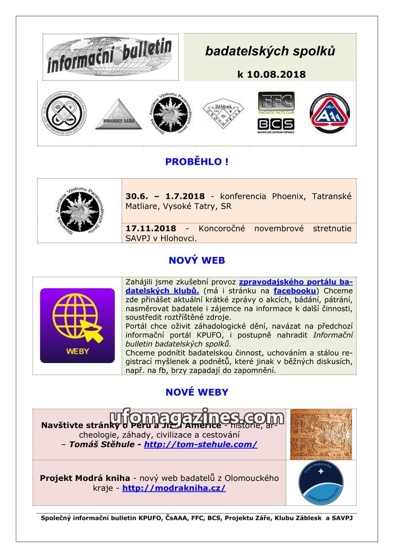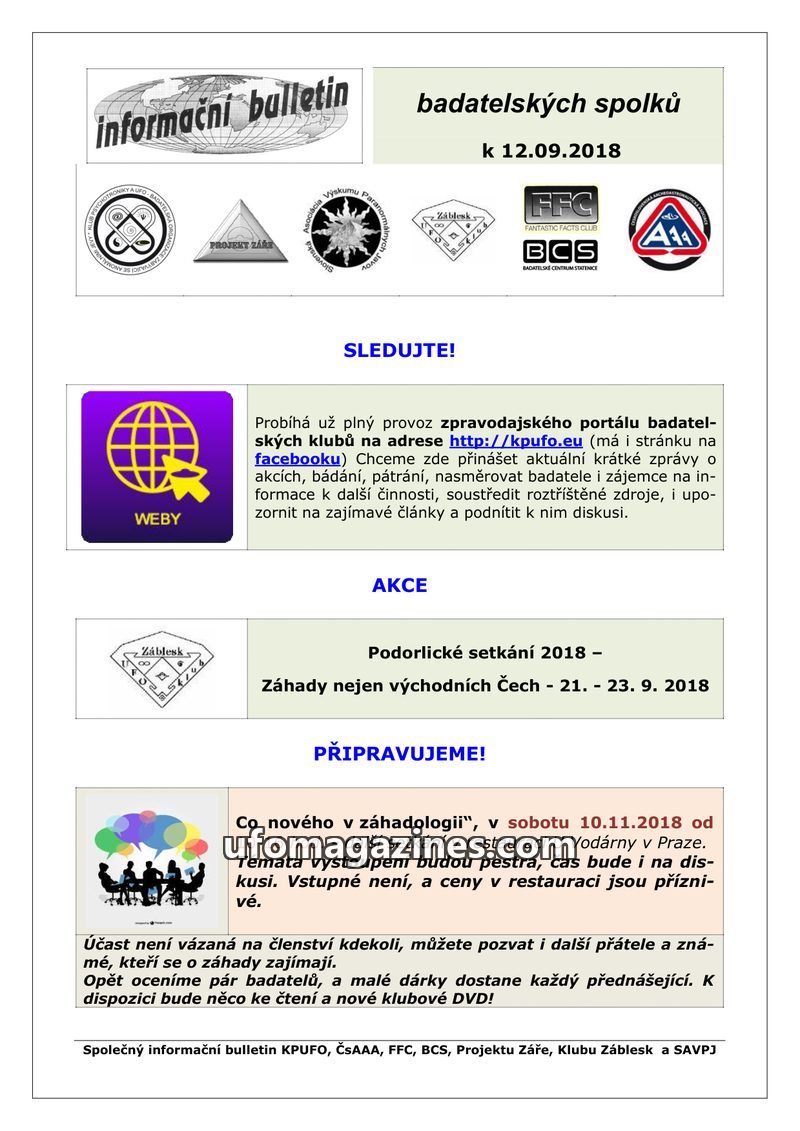 This bulletin serves as a joint publication from several Czech and Slovak research organizations, including KPUFO, ČsAAA, FFC, BCS, Projektu Záře, Klub Záblesk, and SAVPJ. It annou