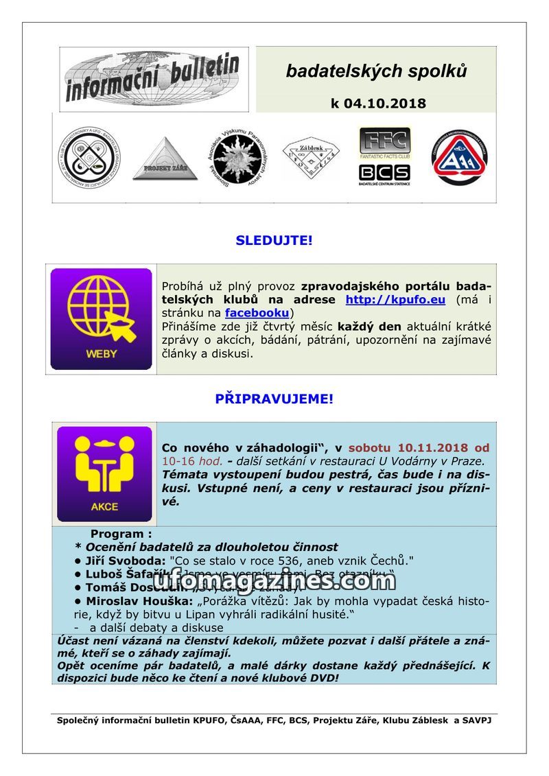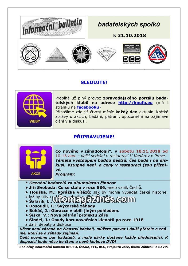 This bulletin from October 31, 2018, highlights the ongoing operation of a news portal for research clubs at http://kpufo.eu, which provides daily updates on events, research, and