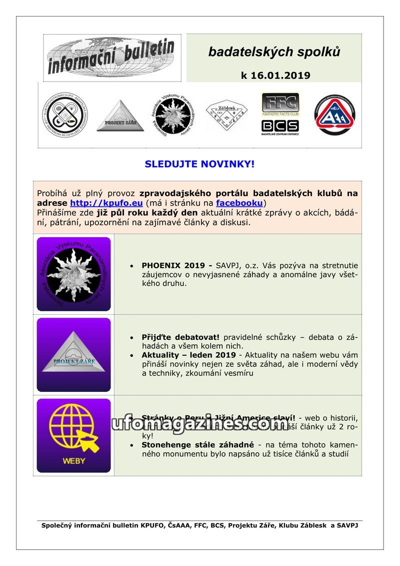 This bulletin from January 16, 2019, highlights the active news portal of Czech research clubs at kpufo.eu, which provides daily updates on events, research, and articles. It annou