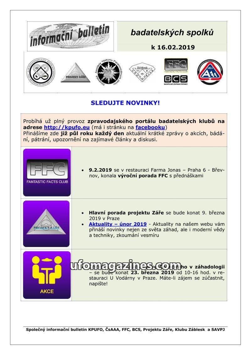This issue of the 'informační bulletin' dated February 16, 2019, serves as a joint bulletin for several Czech research clubs including KPUFO, ČsAAA, FFC, BCS, Projektu Záře, Klub Z
