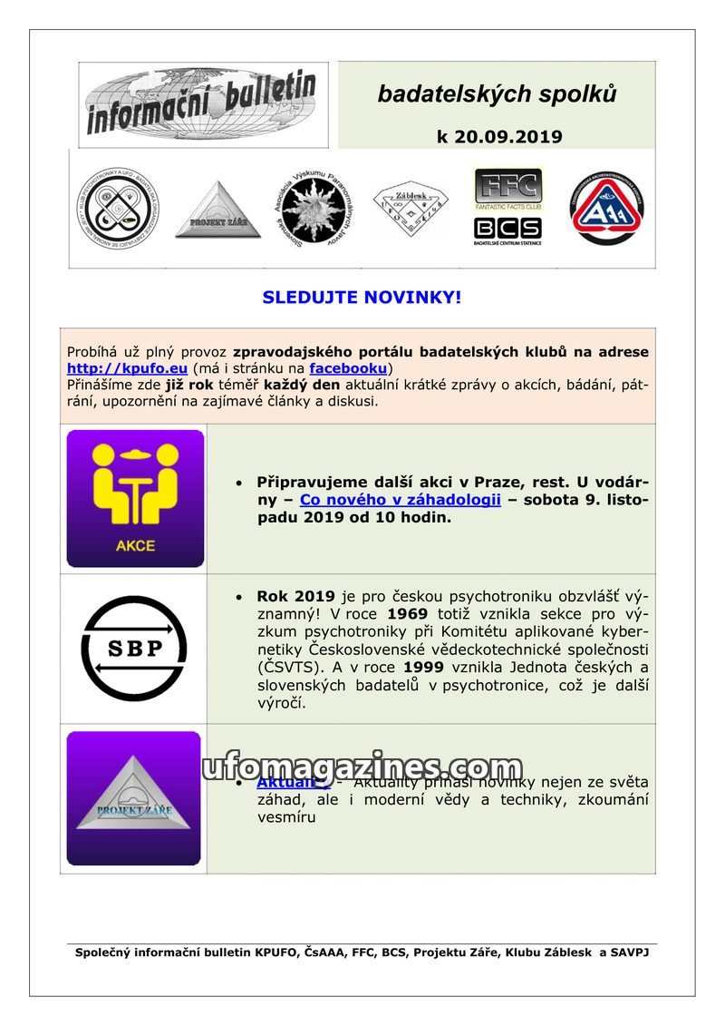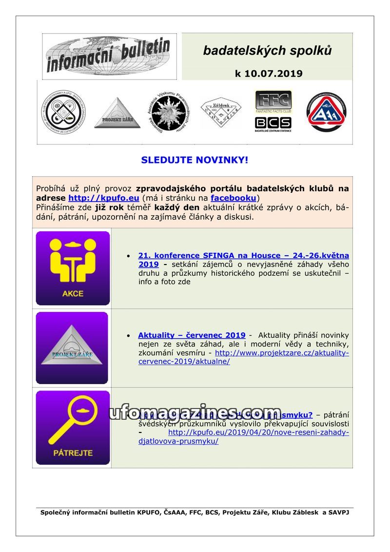 This bulletin from July 10, 2019, serves as a joint information source for various Czech and Slovak research clubs. It highlights the ongoing operation of the zpravodajský portál k