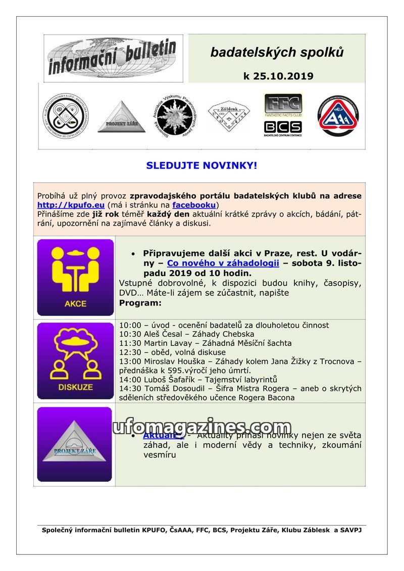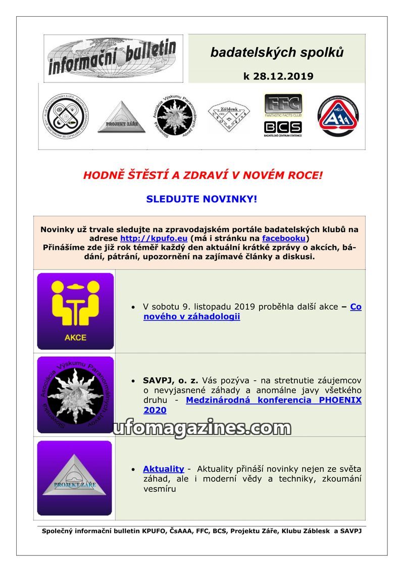 This bulletin from December 28, 2019, serves as an update from various Czech and Slovak research societies, including KPUFO, ČsAAA, FFC, BCS, Projektu Záře, Klub Záblesk, and SAVPJ