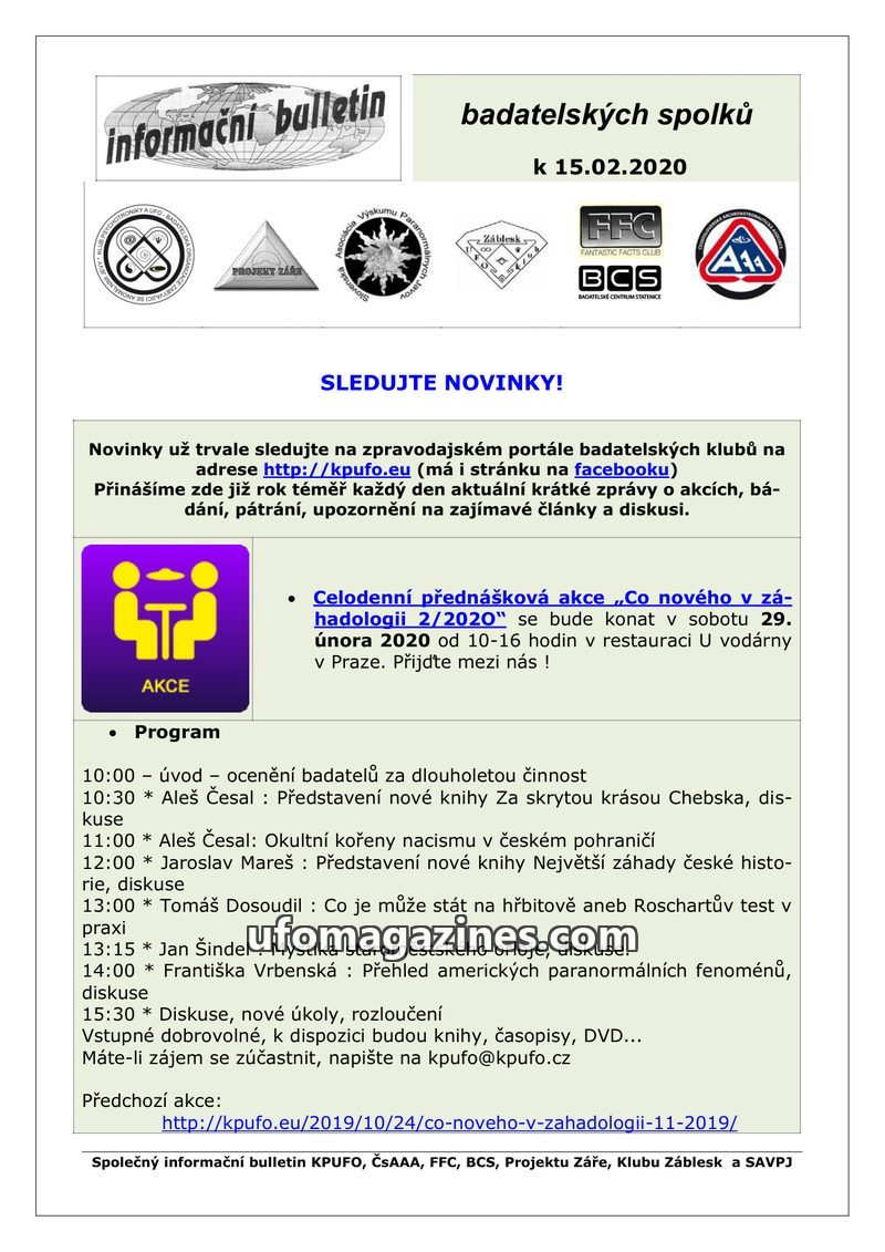 This bulletin from February 15, 2020, highlights upcoming events and recent activities of Czech research societies. A major event is a full-day conference on 'What's New in Ufology